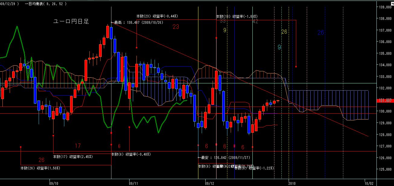 日足トレンドラインがちょうど遅行線と実線がぶつかる辺りに位置してますが、これを強く超えてくようなら、そのまま12/18から一節9日目がちょうど先行スパンのねじれによる転換日となってますので、この辺りで加速するか、反転するかを見極めたいですね。