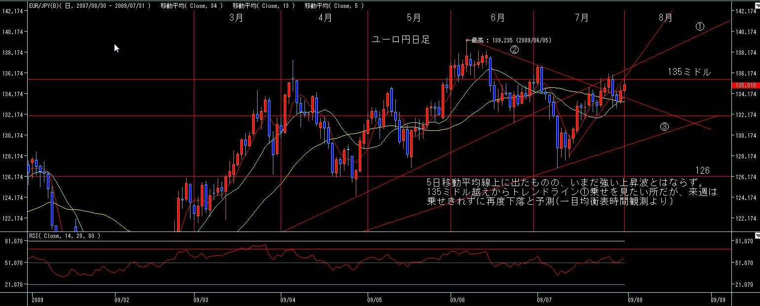 5週間後からは7月第一週の下値を割らない限りは転換線上昇していきますので、週足的には今月前半は円高気味、後半から末以降は円安に振れ易いチャートかと。