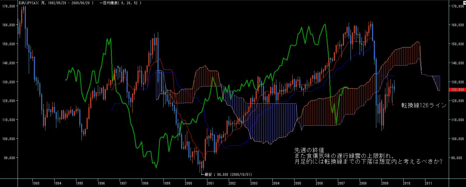 流れが急に変わるとは思えませんが、来週は日足実線の雲が非常に薄くなりますので、雲の上限割れはあまり意味をなさないかも?。