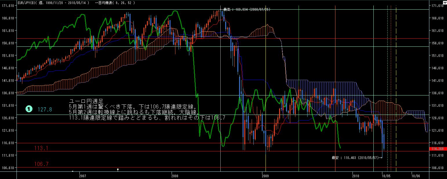 来週は113.1~113.6陽連限定線を割って、5/6安値に向かうのでしょうか?