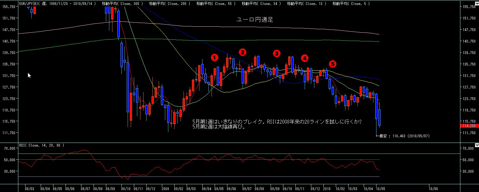 ユーロドル週足、2008年10月31日の安値に接近。大陰線を引いてるものの、こちらはRSI20を割っている点が気になる所。