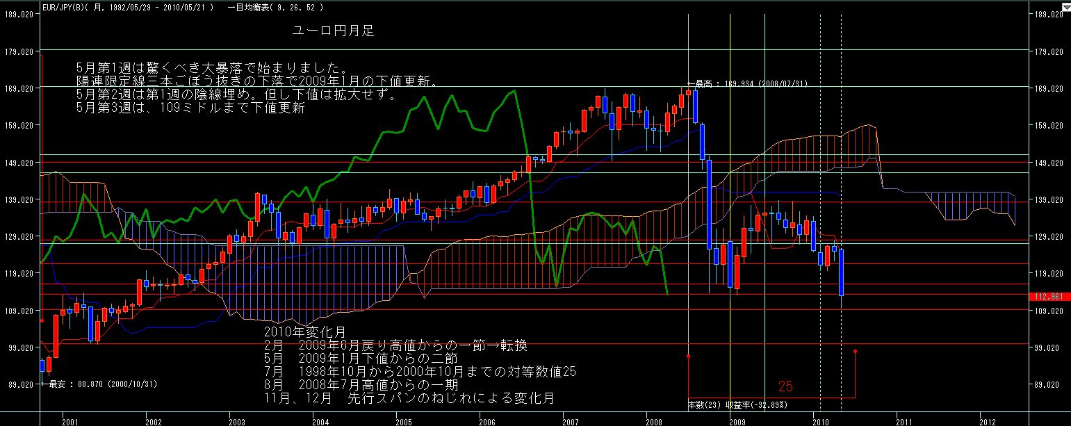 ギリシャ問題から他国への懸念やEU自体の財政問題へと、懸念は広がる一方で、ドル円がそれに併せて方向感の無い動きとなってましたが、いよいよ日足遅行線が雲の下限を割れるかどうかという場面に来ています。