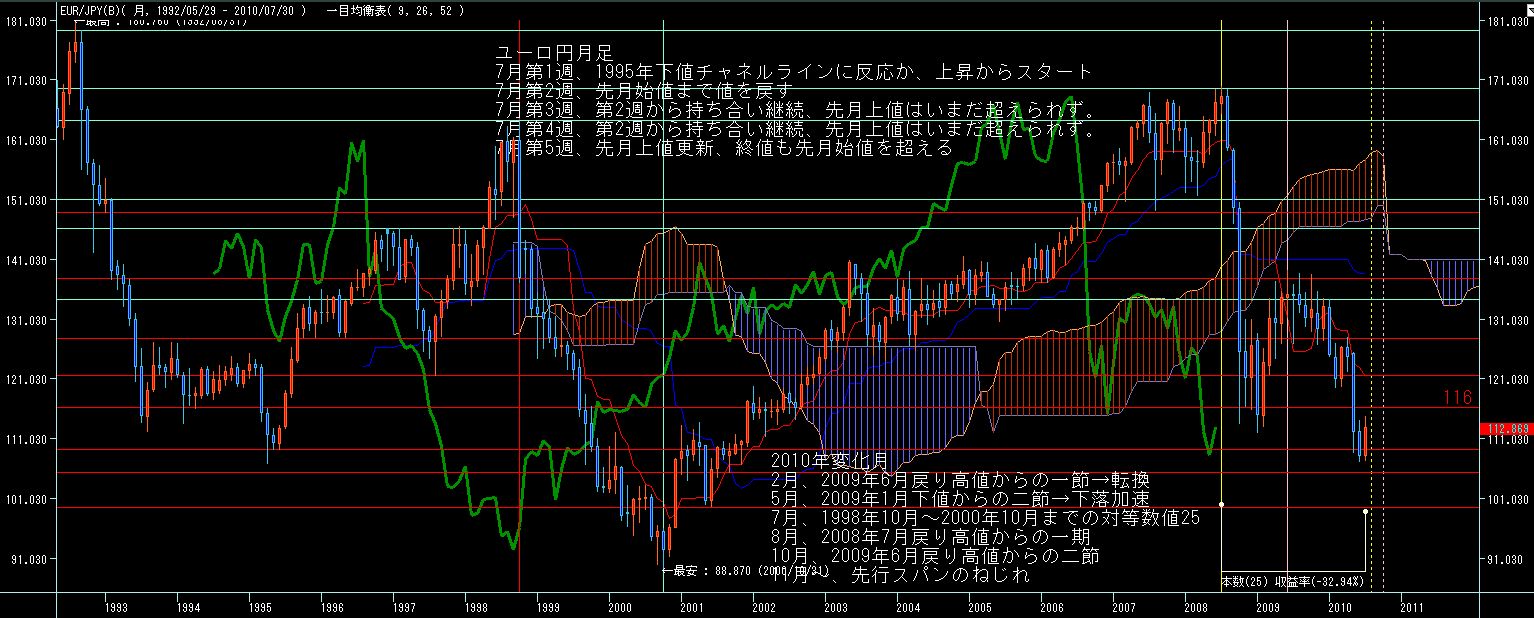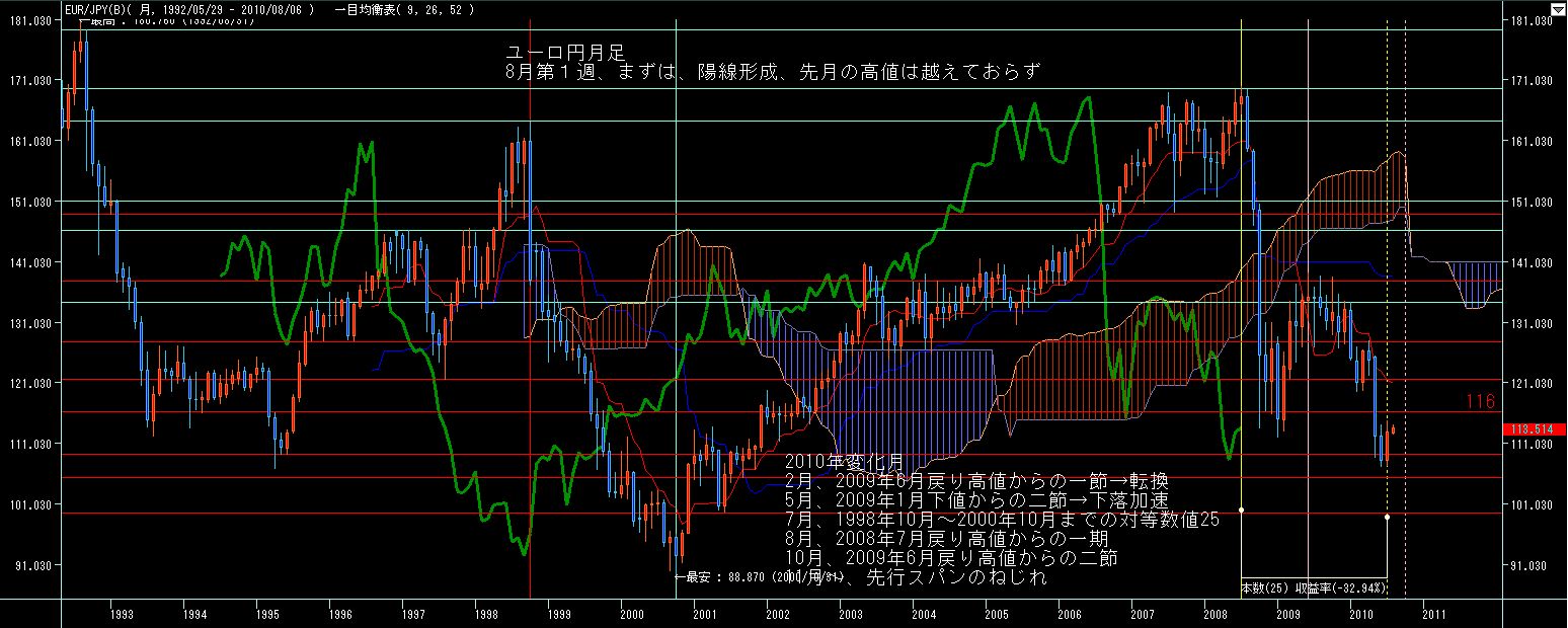 これで、 7月、1998年10月~2000年10月までの対等数値25をこなした訳ですが、8月は2008年7月戻り高値からの一期でも有ります。