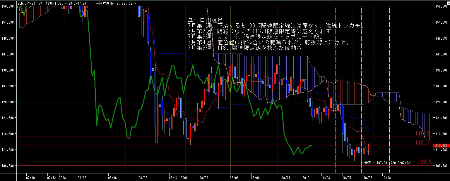 来週火曜が、先の6/29下値からの26日目。ここから基準線が上がって行きますので、これに逆らうように値が基準線を割って行くのか、はたまた基準線の上昇に煽られるように上昇していくのか。