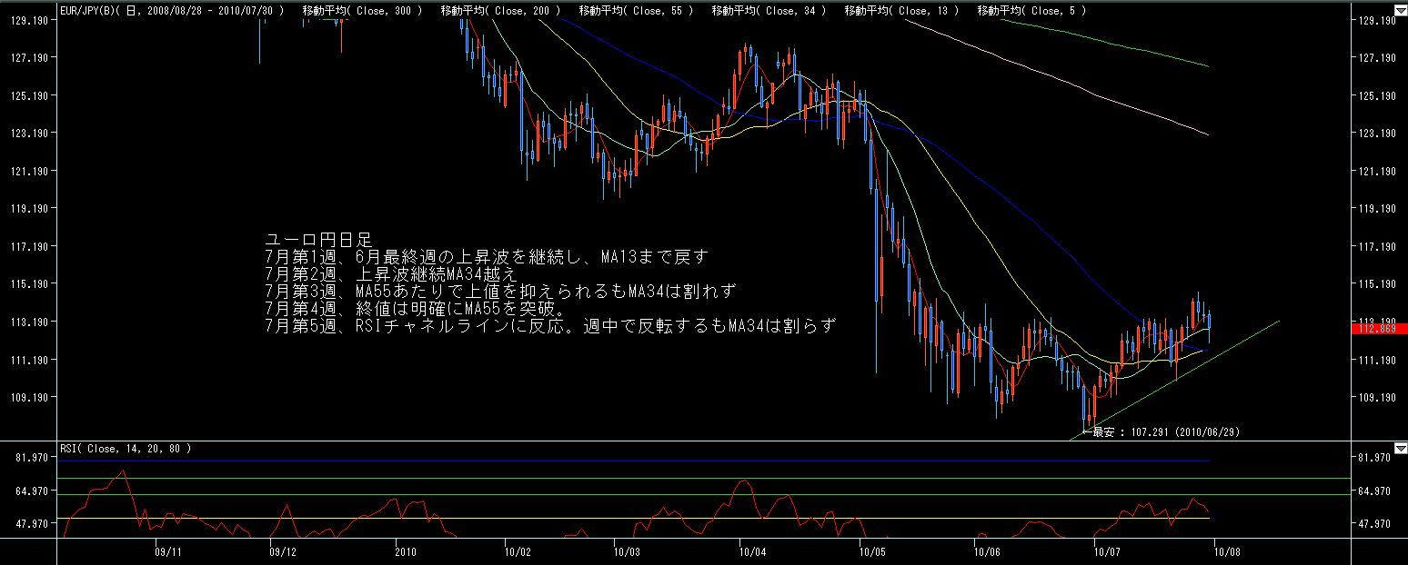 この上ヒゲ陽線で、元の113ミドルを割って終了しましたので、週足的にはまたまた方向予測が立たない状況です。