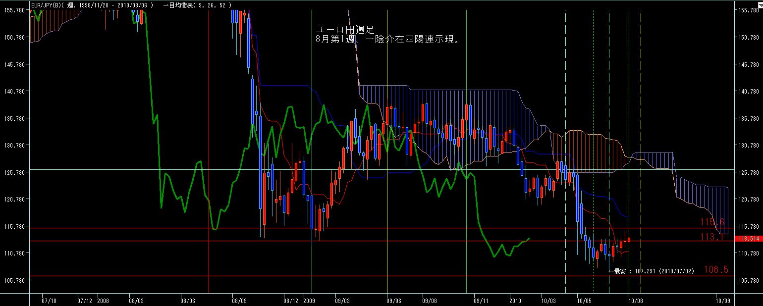ユーロドル週足、一陰介在七陽連、連続陽連としても五陽連示現。但し、先の6/11下値から来週で9週目。エネルギーが一旦出きったかどうかを試す週となりそうです。