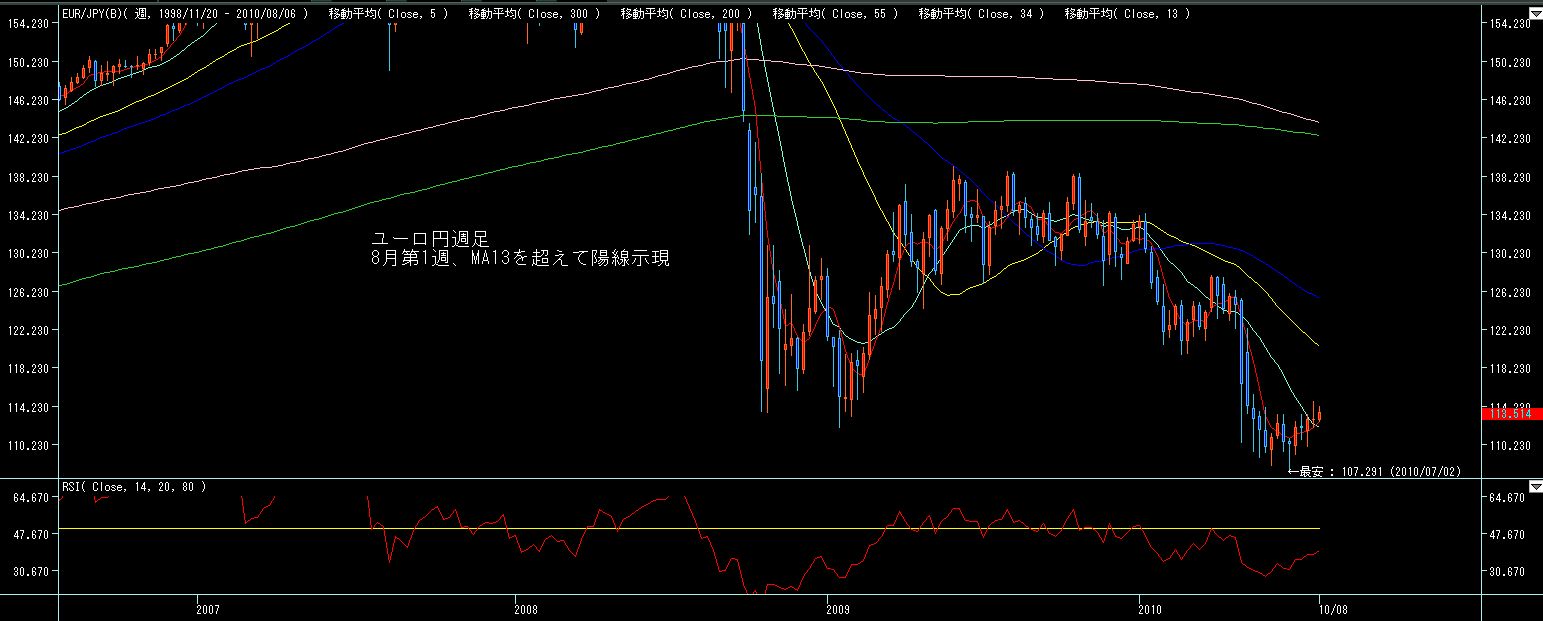 特に来週は先の下落開始直前の高値2009/10/16週からの42週目にあたりますので、同日柄33週の次の週から持ち合いに転換している事を考えると、流れに変化が出そうな気配もします。