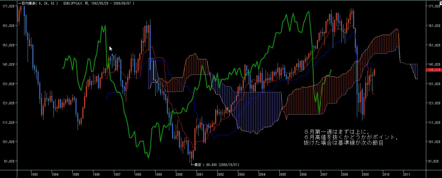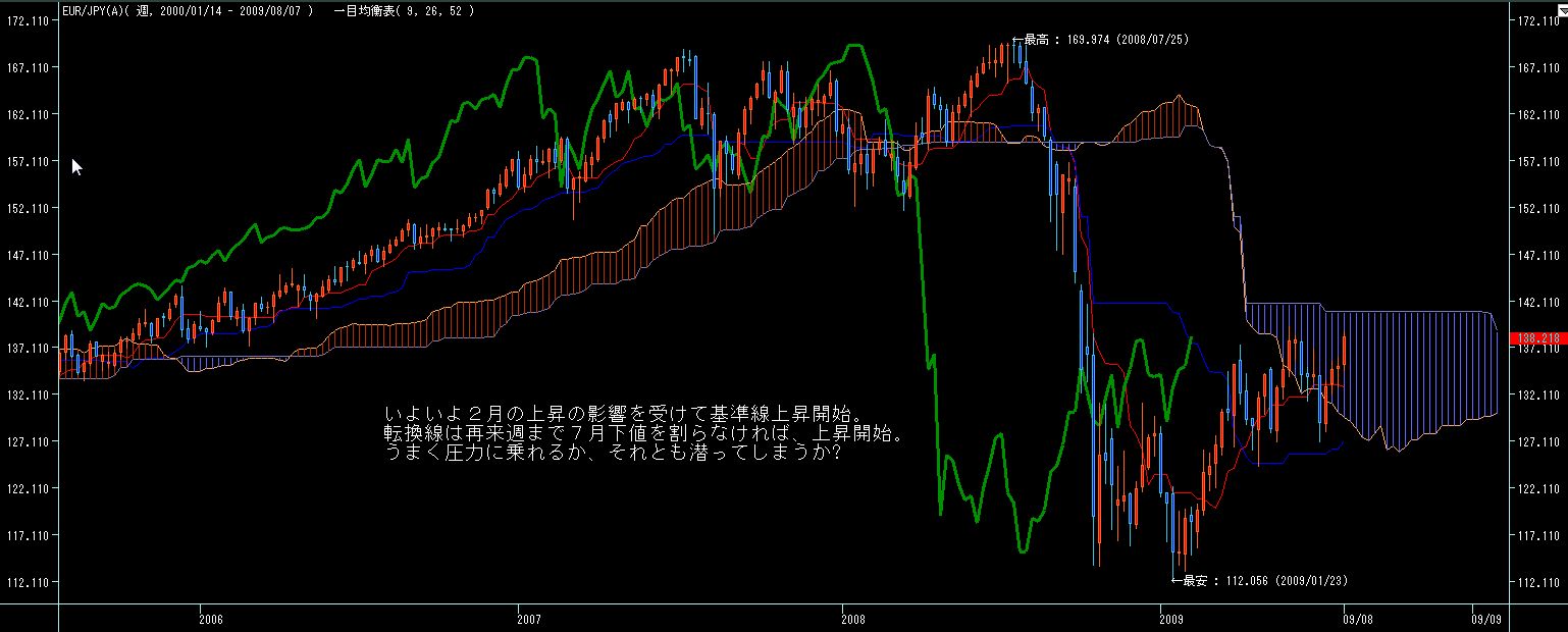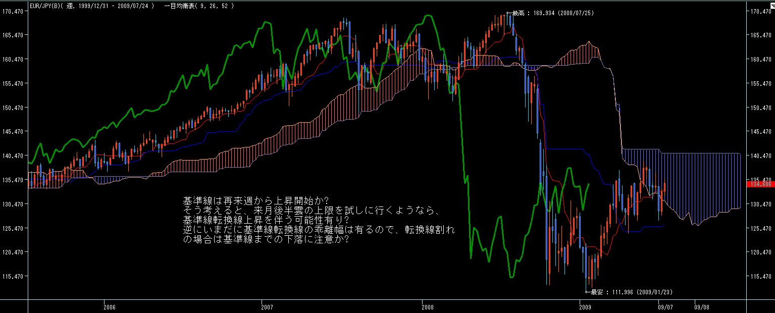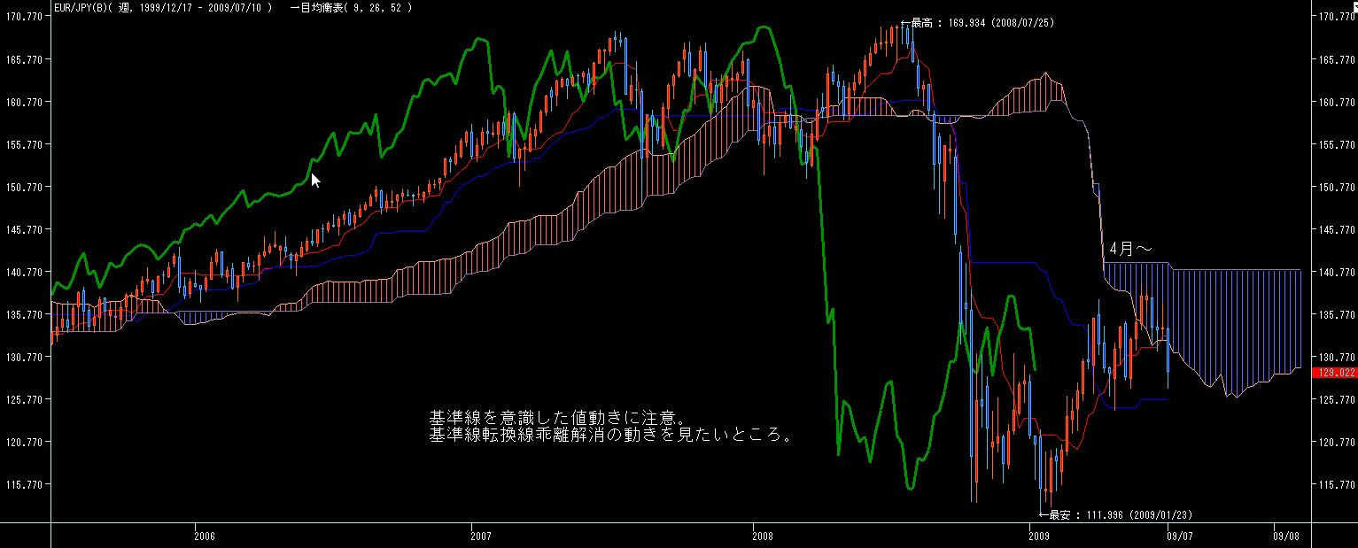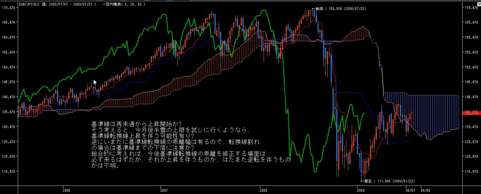 5週間後からは7月第一週の下値を割らない限りは転換線上昇していきますので、週足的には今月前半は円高気味、後半から末以降は円安に振れ易いチャートかと。