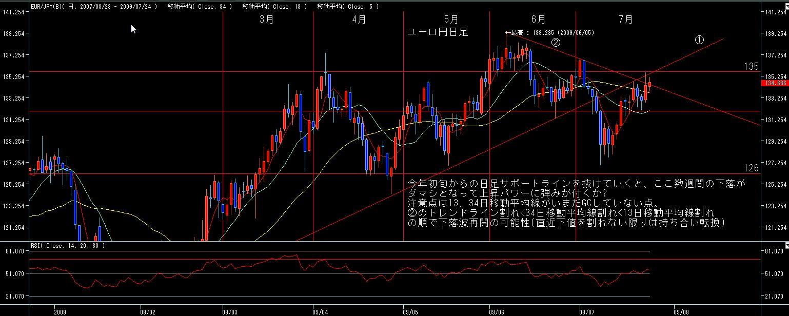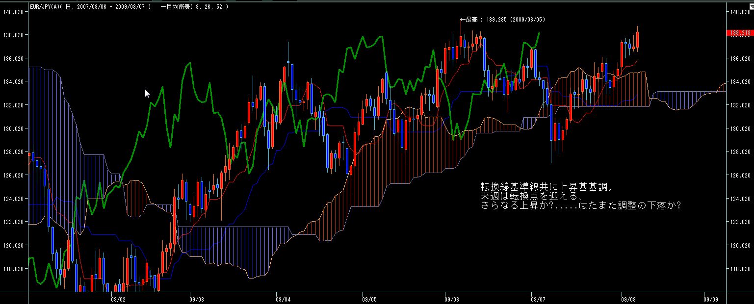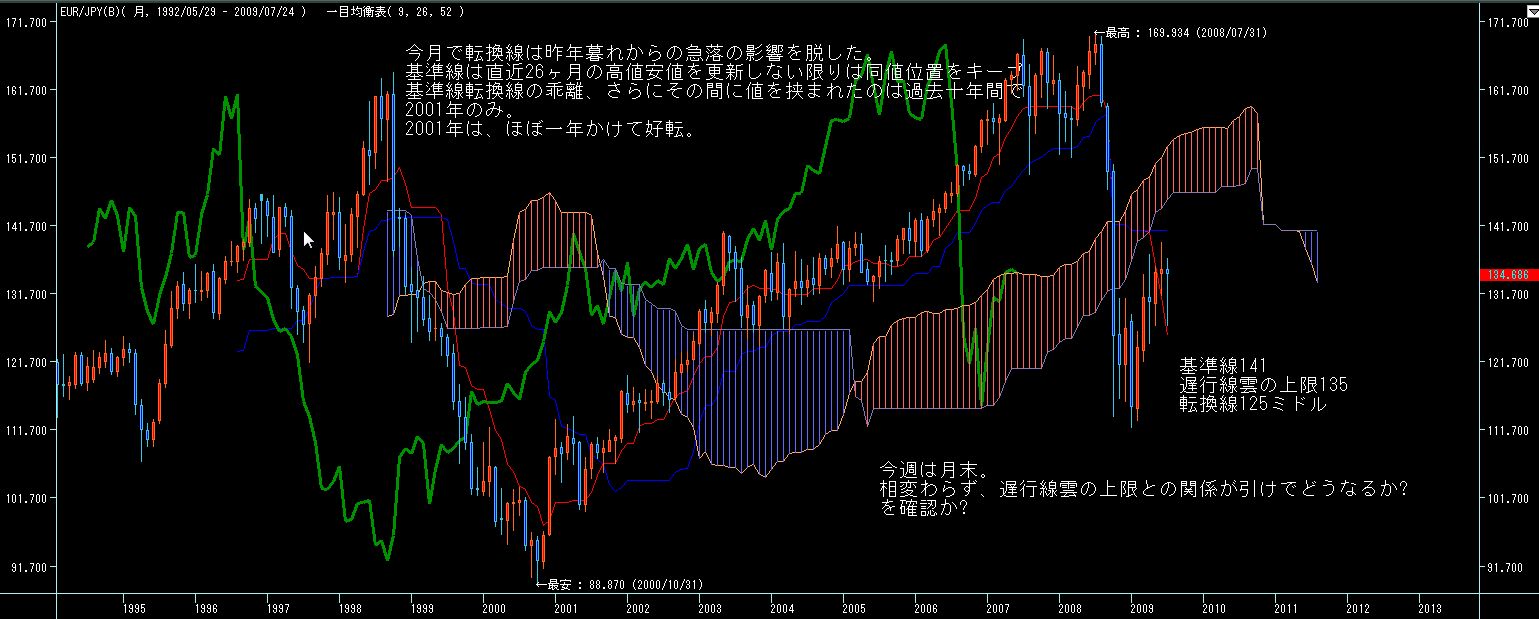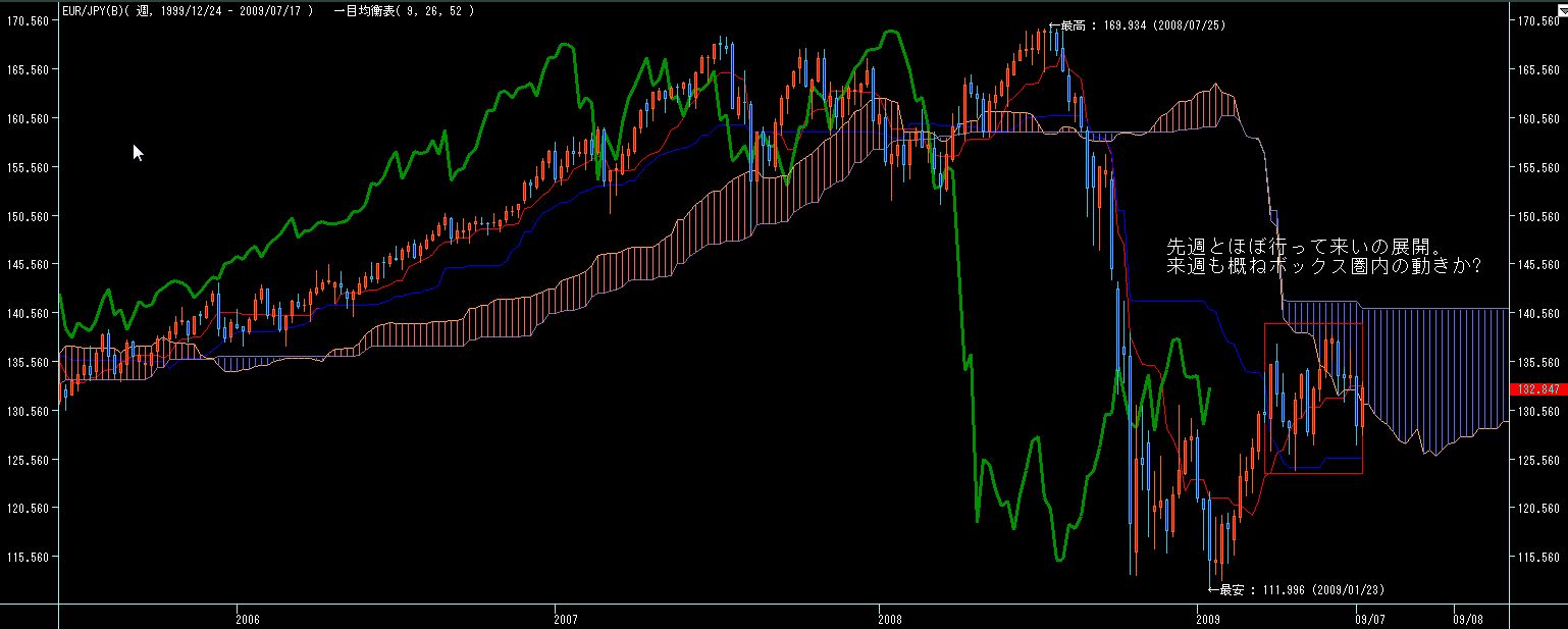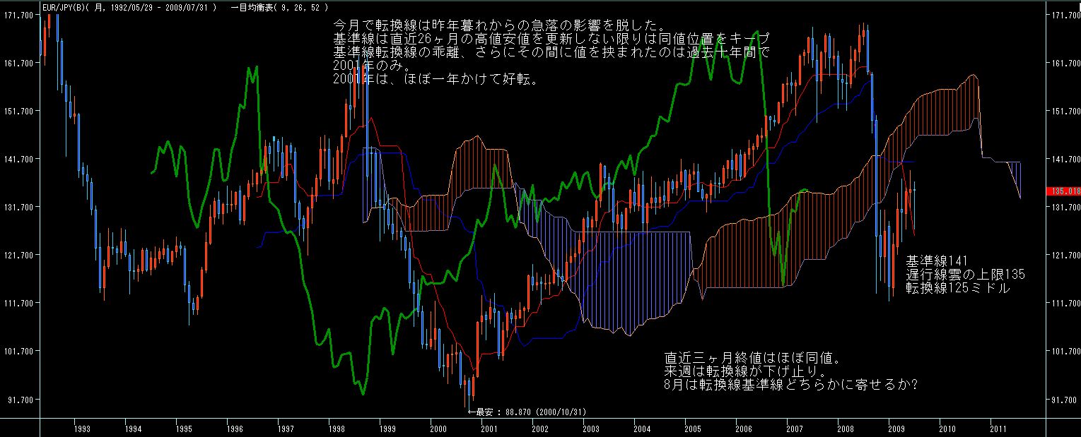 5週間後からは7月第一週の下値を割らない限りは転換線上昇していきますので、週足的には今月前半は円高気味、後半から末以降は円安に振れ易いチャートかと。