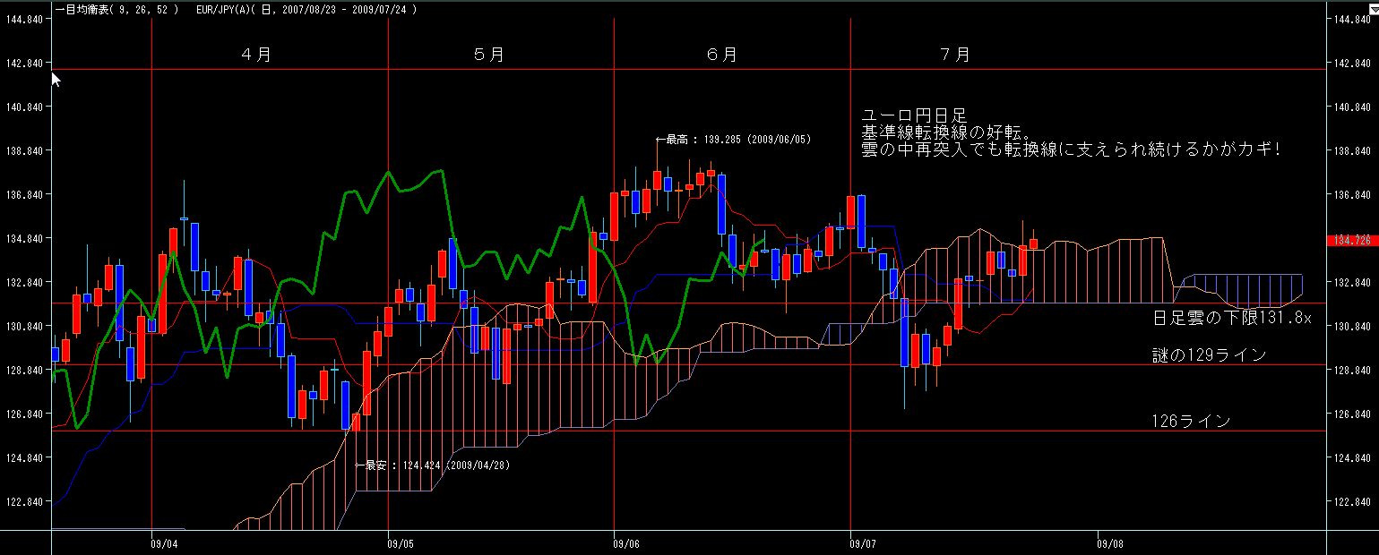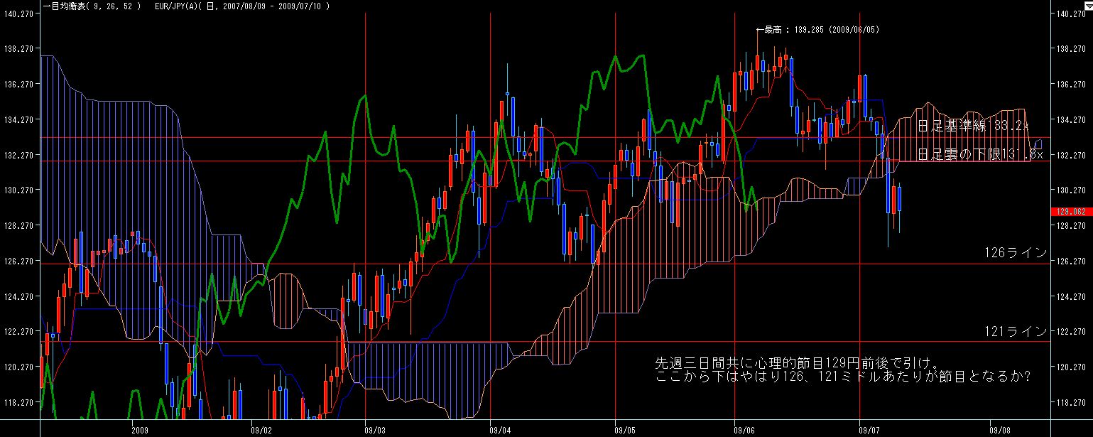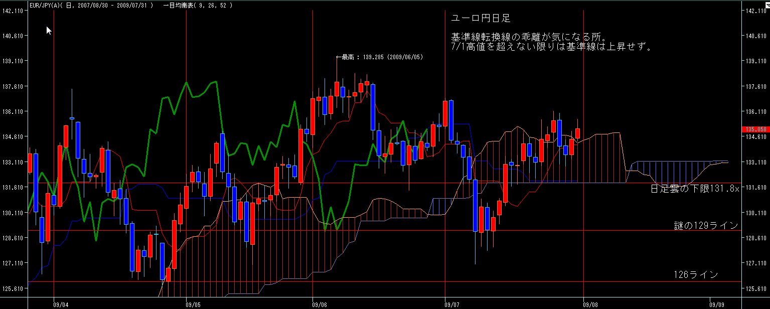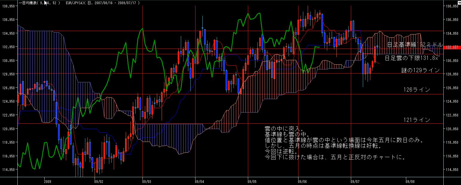 下はオーバーシュートされながらもかろうじて129ラインでサポート、上は日足基準線あたりでレジスタンス、という感じで、日足は転換線が下に流れて弱含みの雰囲気はかもし出してますが、基準線の下落は伴ってませんので、急落の雰囲気では無いですが、なにぶん雲の中に収束しているので、予測がしずらいですね。