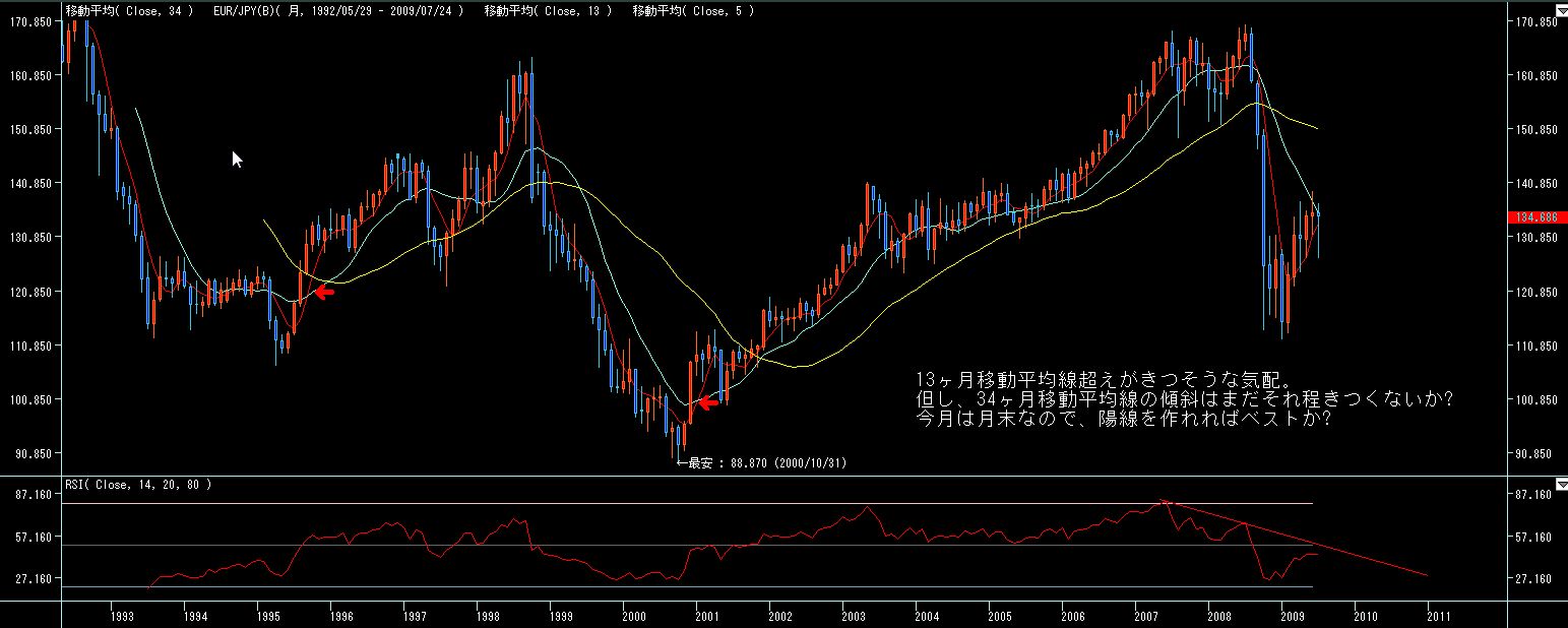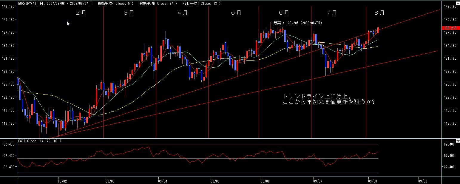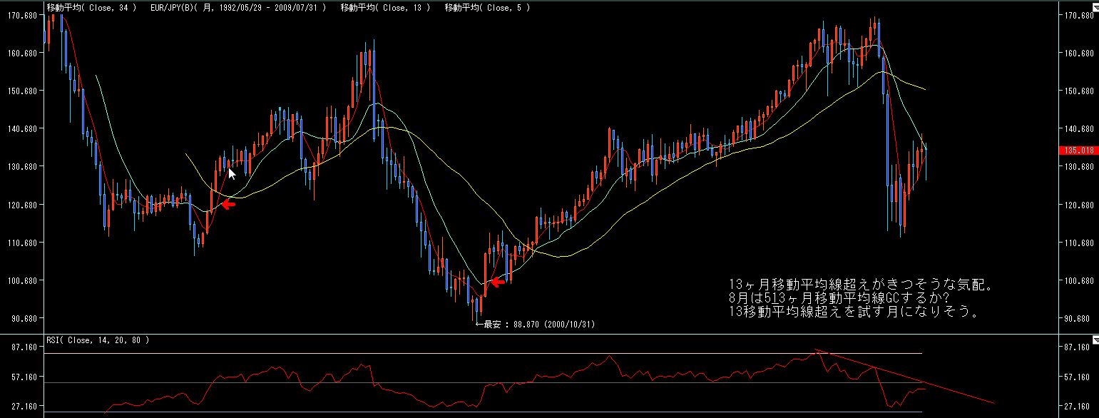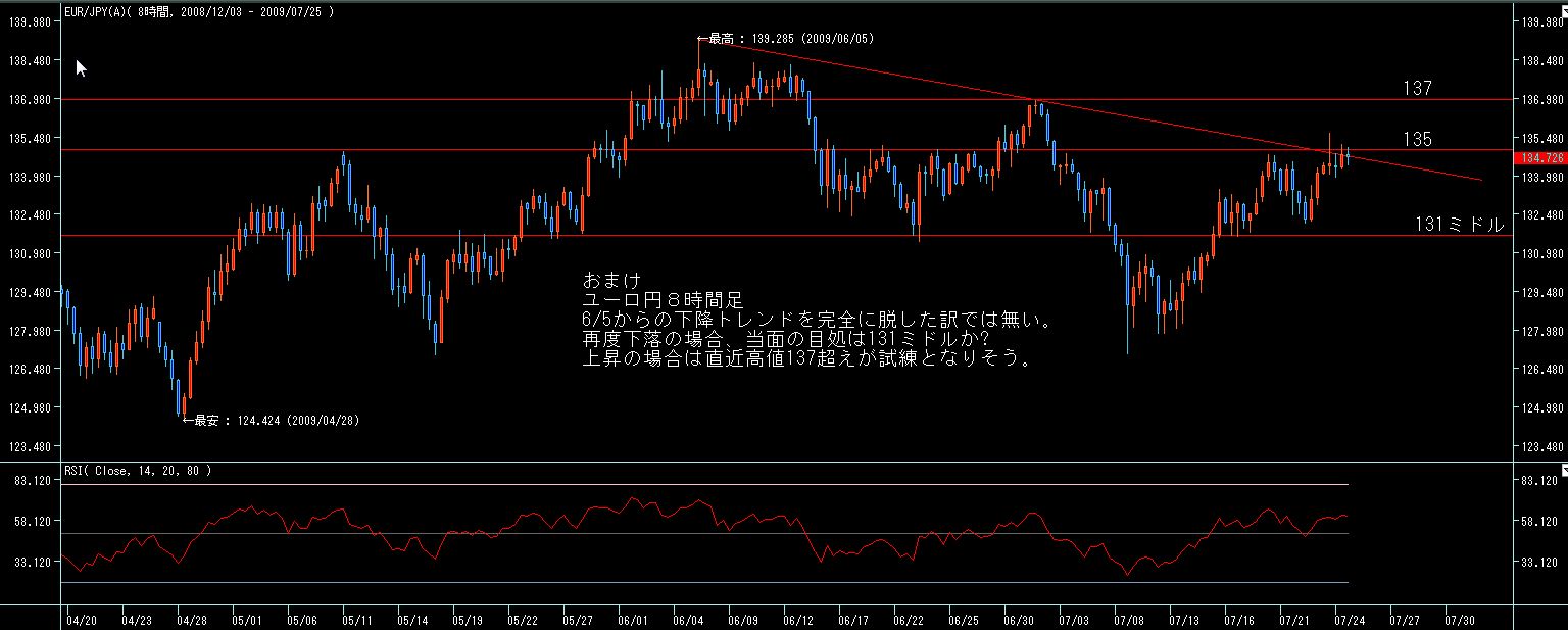 ここ数ヶ月135ラインで月末を迎えてますが、5月は強い陽線、6月は気迷いの陽線、7月は上げ渋りの陰線、と上値の重さが目立つ展開になってます。
