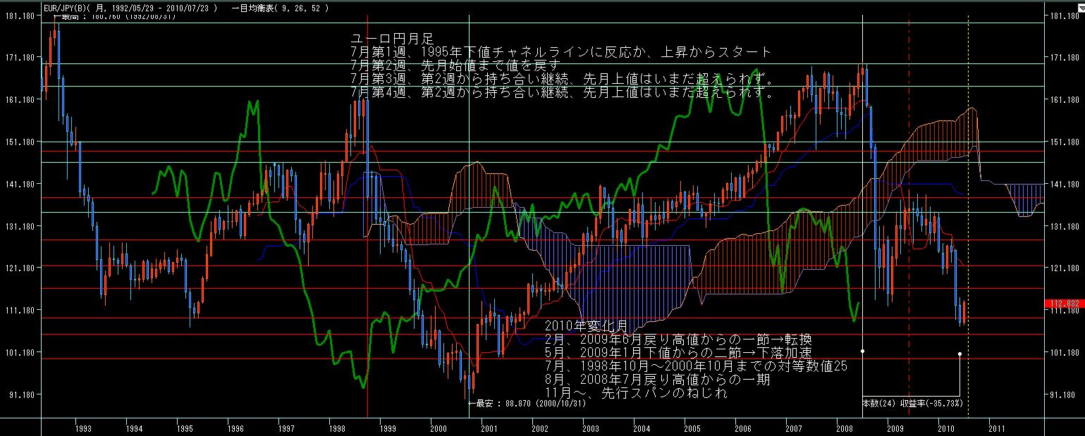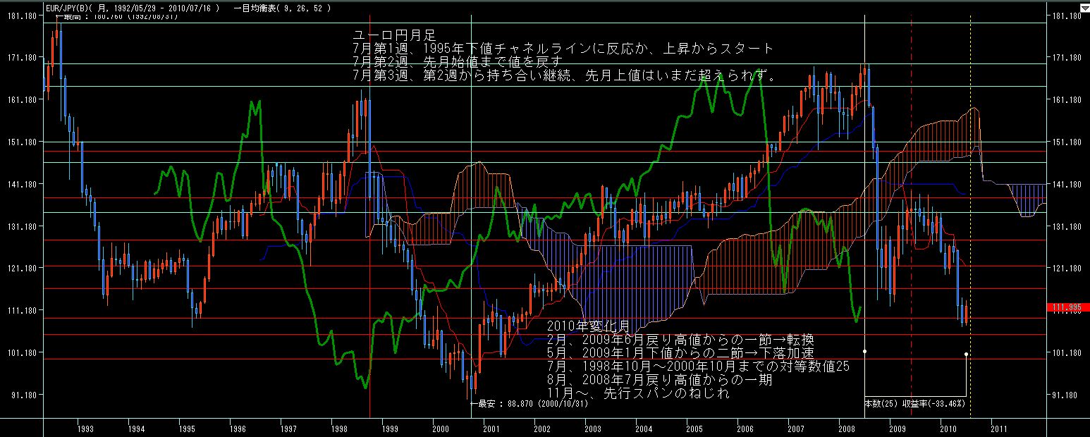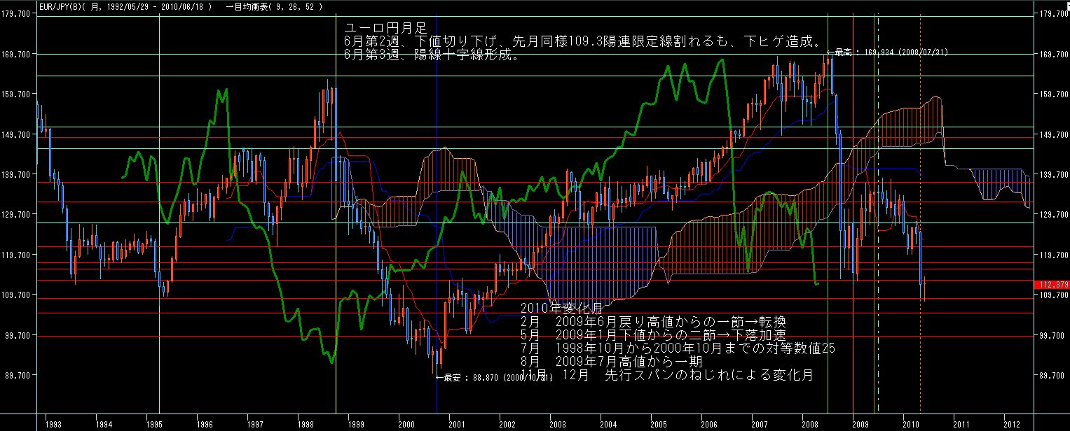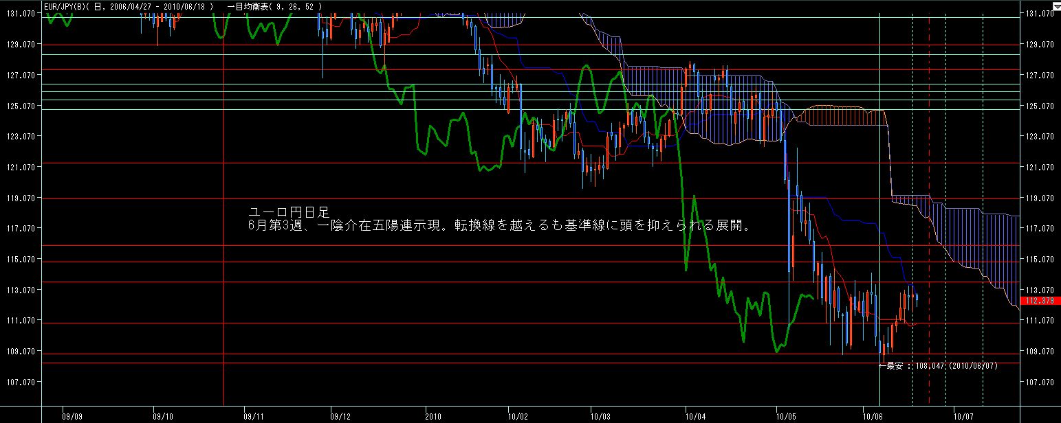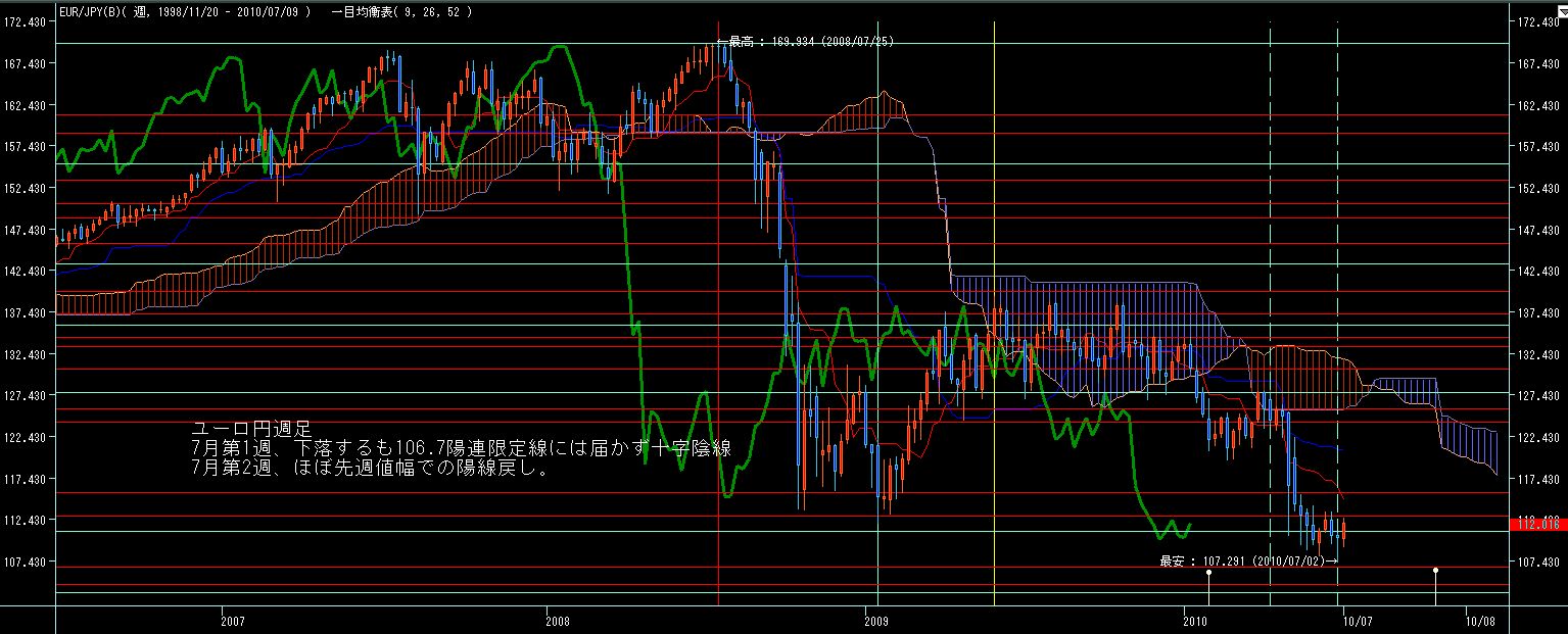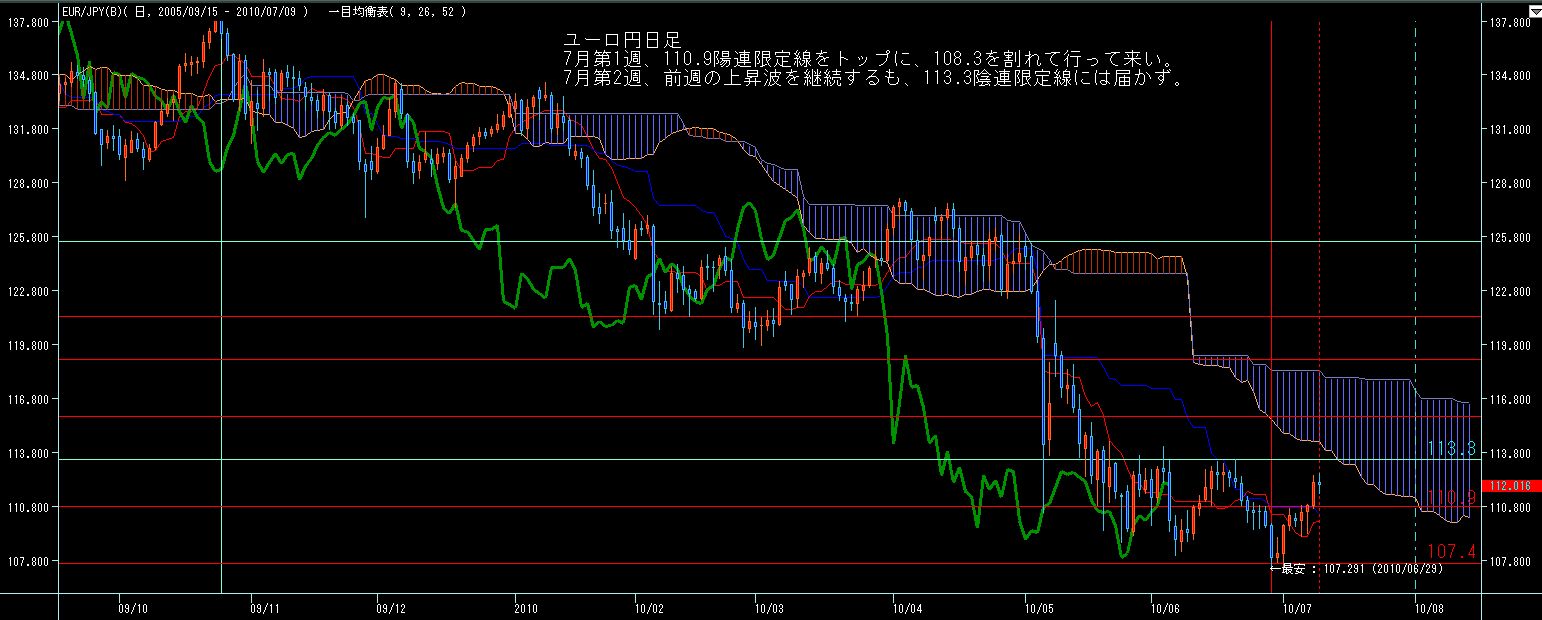ユーロドル週足、ほぼ先週の値幅内にて、十字線。基準線に頭を抑えられており、いよいよ上昇継続か反転下落かが問われる局面か?