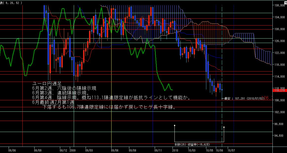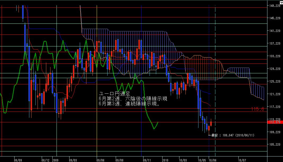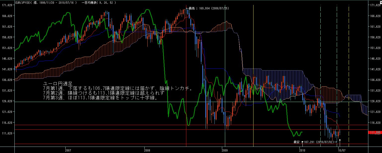 >ユーロ円週足、下値からの反転六週目、来週の基準線と並ぶと思われる1.3058陰連限定線手前で抑えられているので、これを越えるかどうかが上昇継続のカギか?