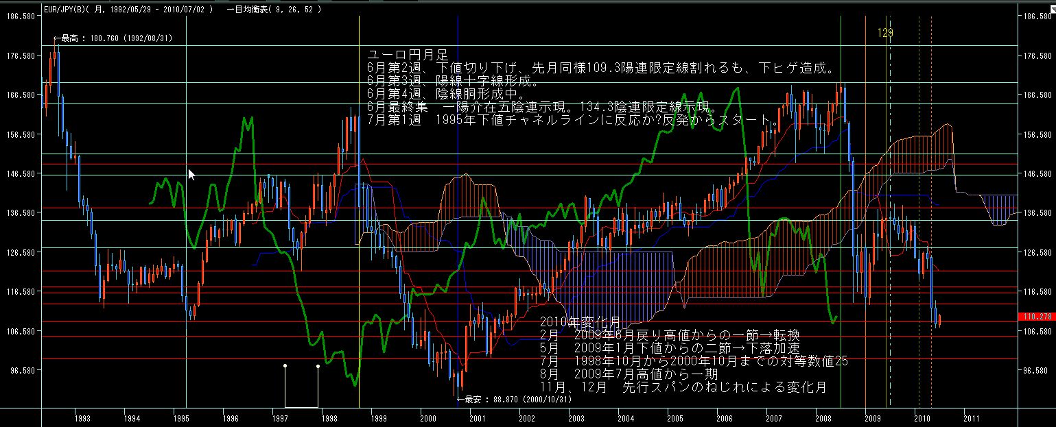 >ドル円日足、5/6の大陰線から41日目とほぼ基本数値42に準じた日柄で下値割れ。そこからほぽ一期で下落転換、さらに下値割れとなってますのでね弱含み継続か。