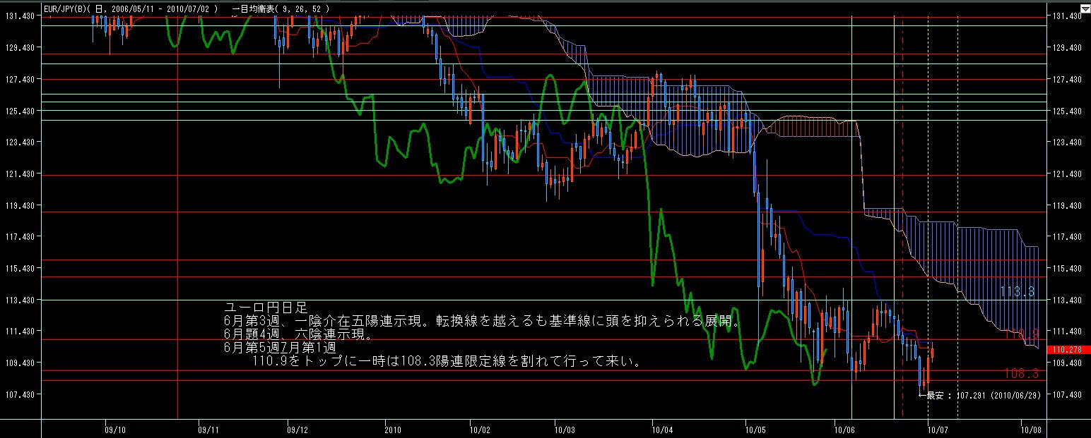 >ユーロ円日足、実線は雲の上限越え、来週は遅行線が雲の上限を超えるかどうかがカギとなりそう。こちらもそのあたりの陰連限定線は1.3058