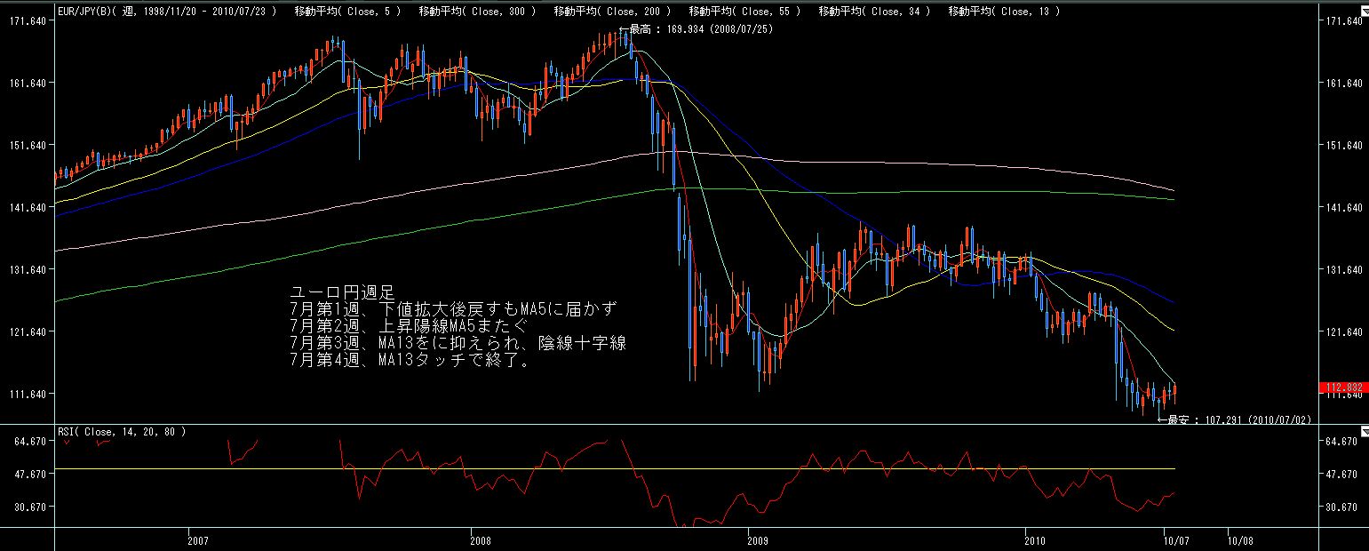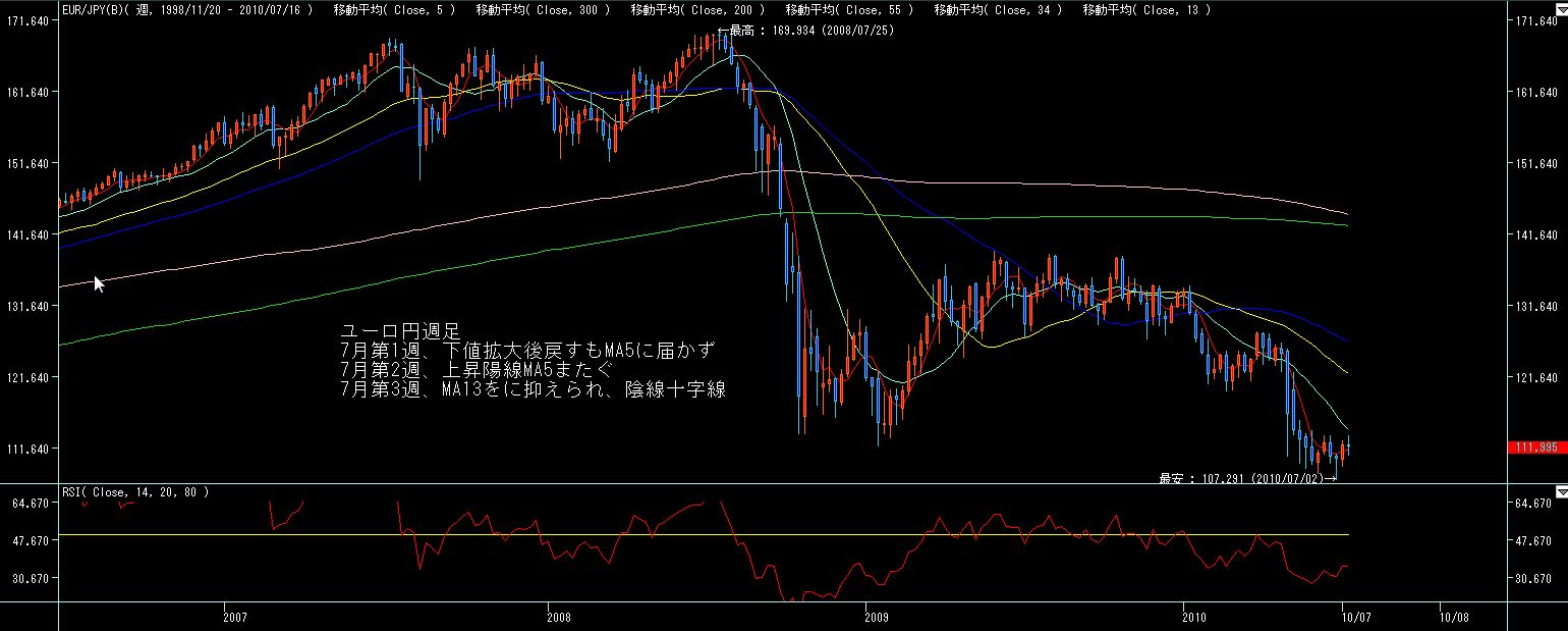 ドル円週足、先週の予測の通りで、一旦反発してますがMA5は越えられず。