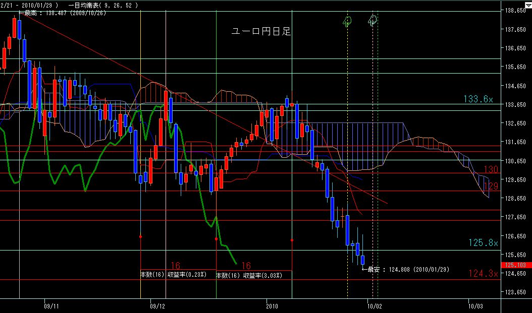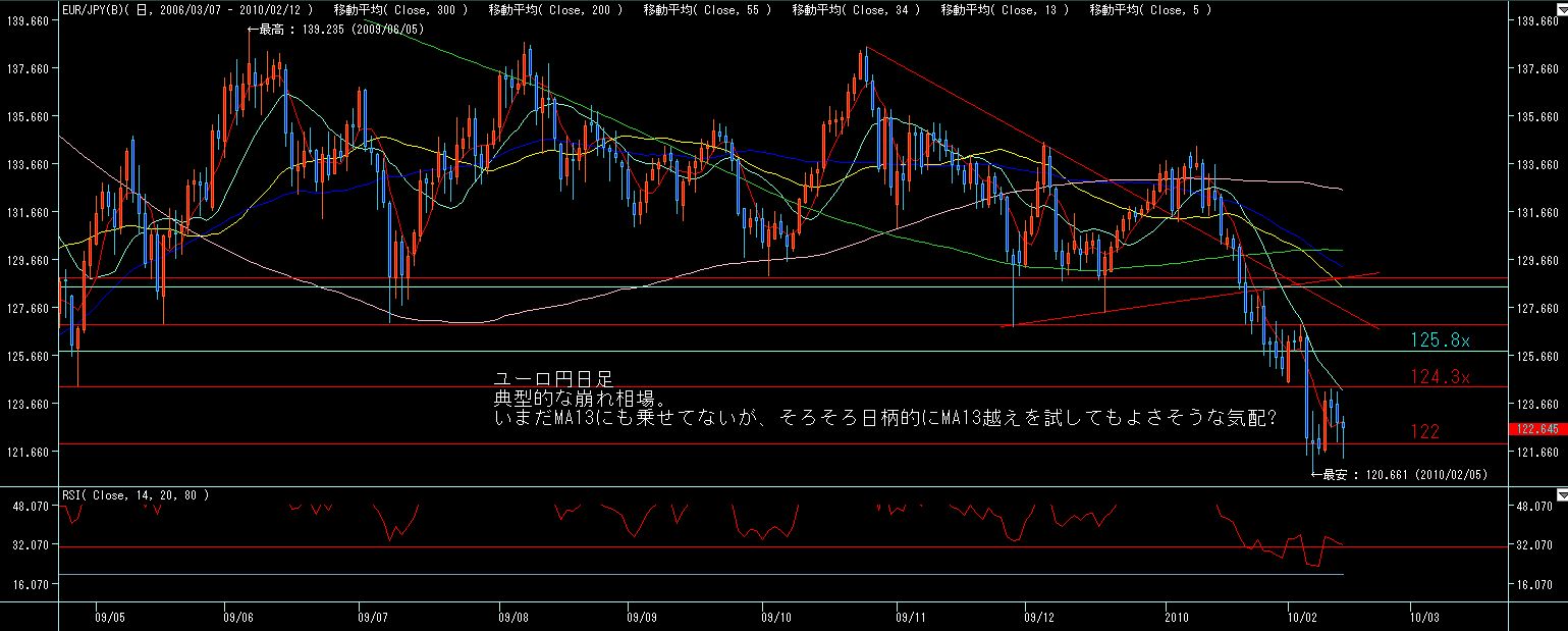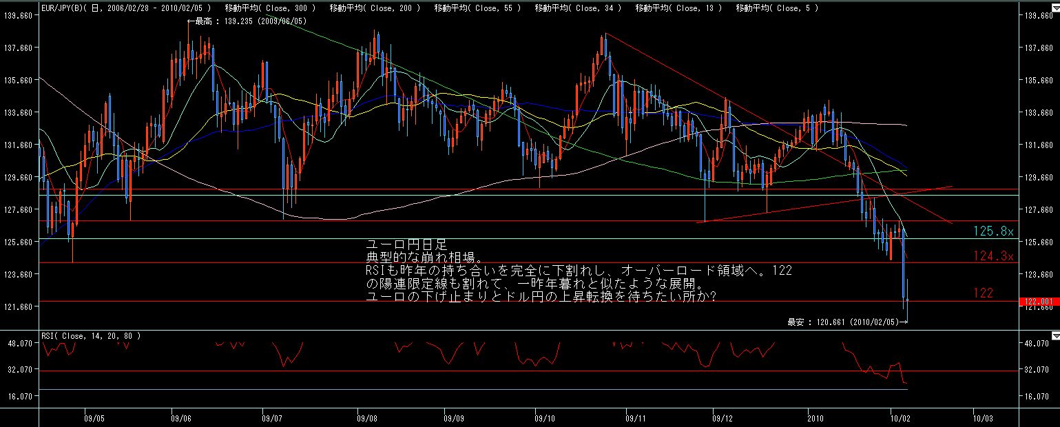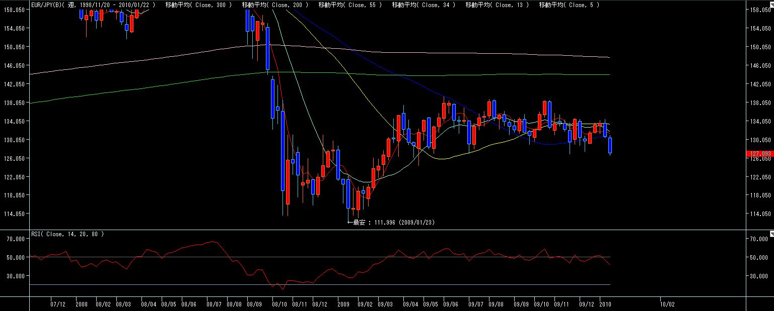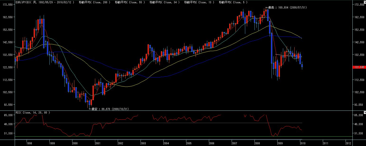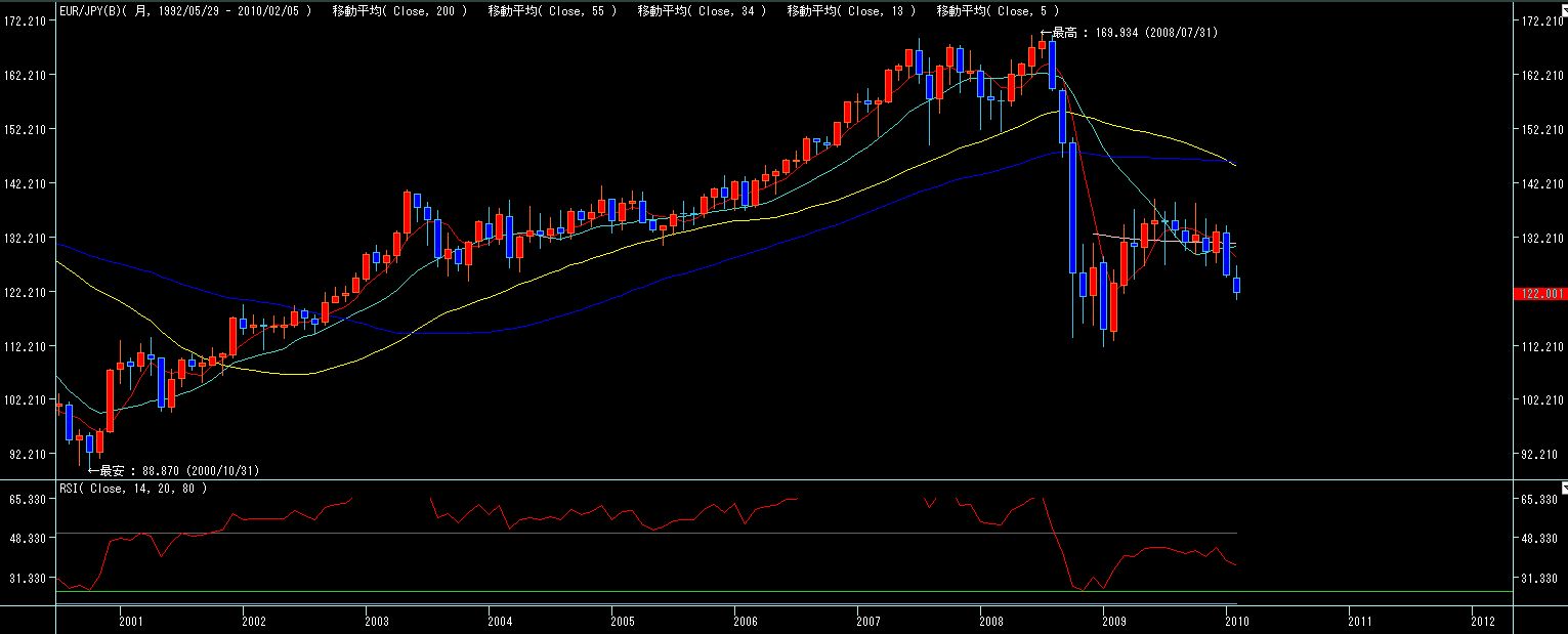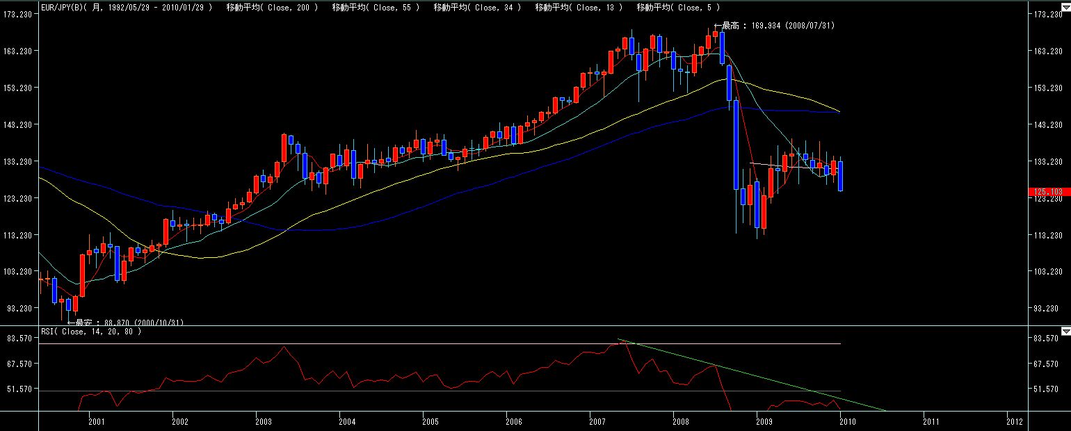 2010年最初の月が終了しましたが、戻りきれずに下落→下値更新、という典型的なパターン示現で、とうとうザラバ125円割れという展開になりました。