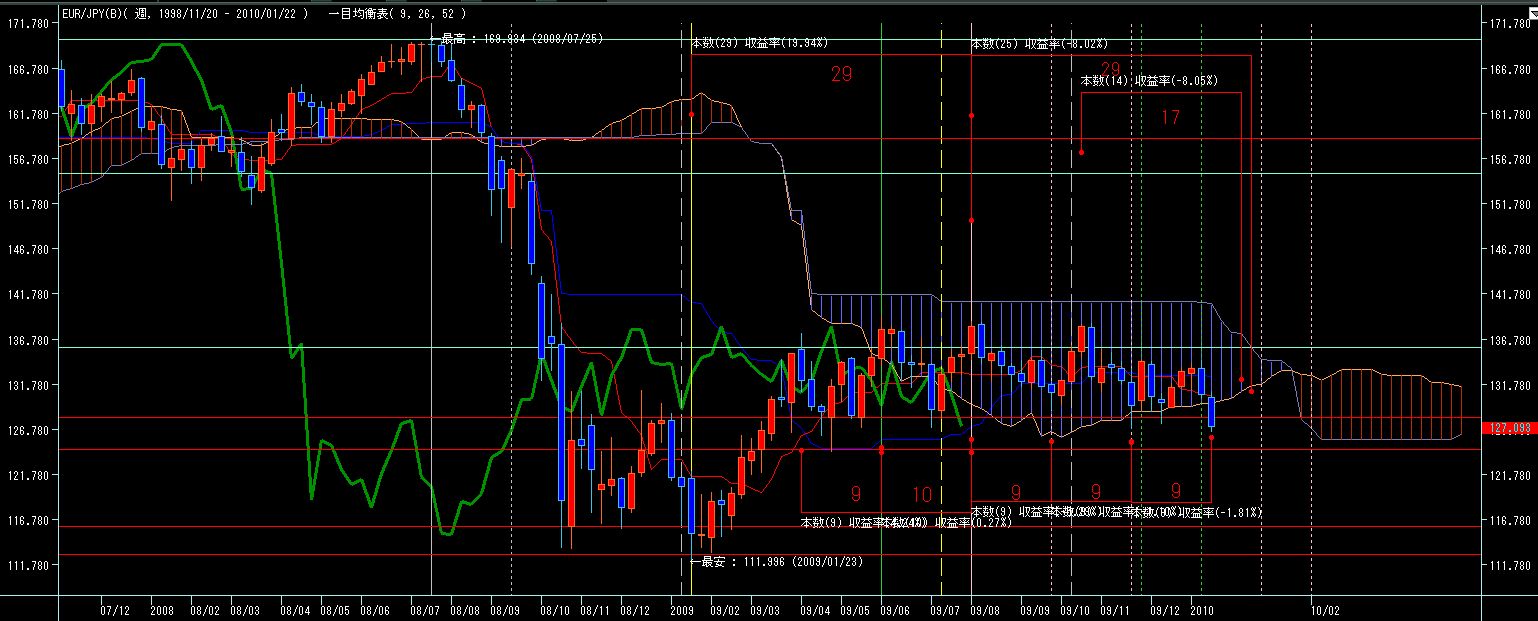 >一目均衡表の値幅観測を使ってみましたが、どうもしっくり来ません、というか、11/27や12/18の下ヒゲが長すぎて、