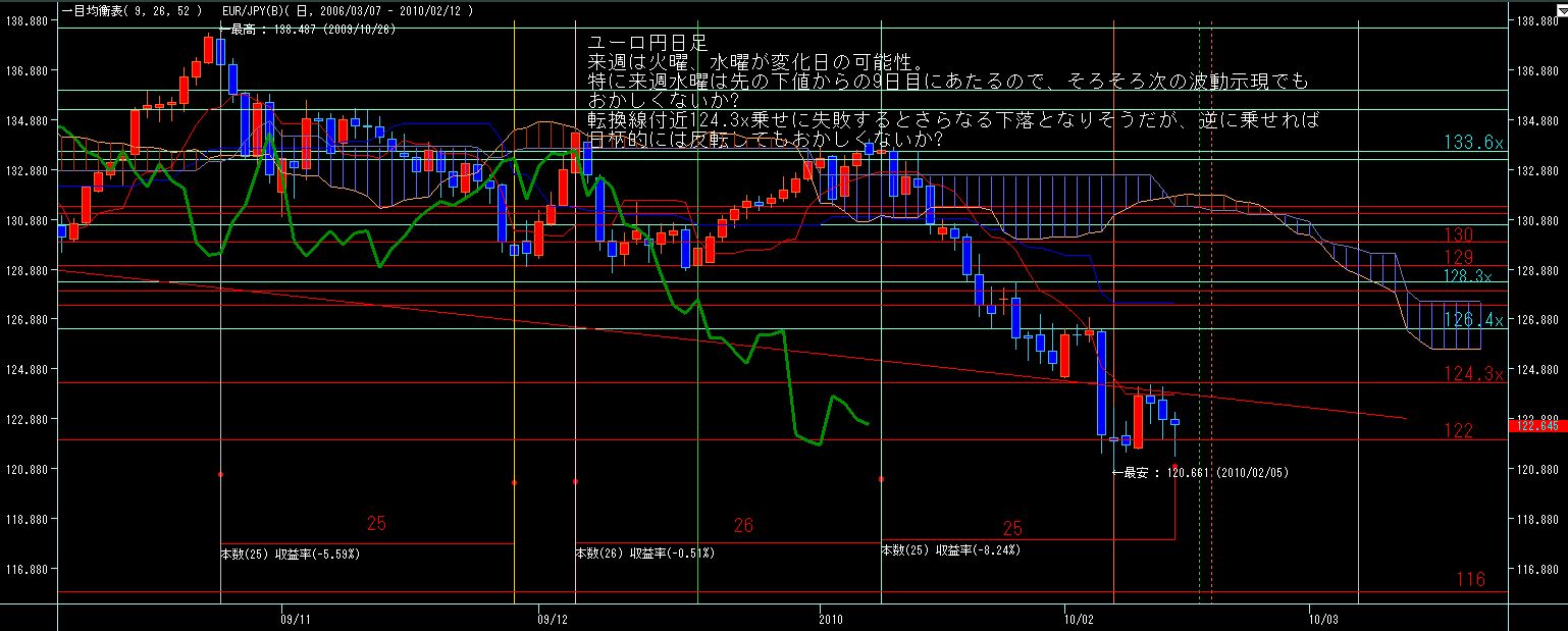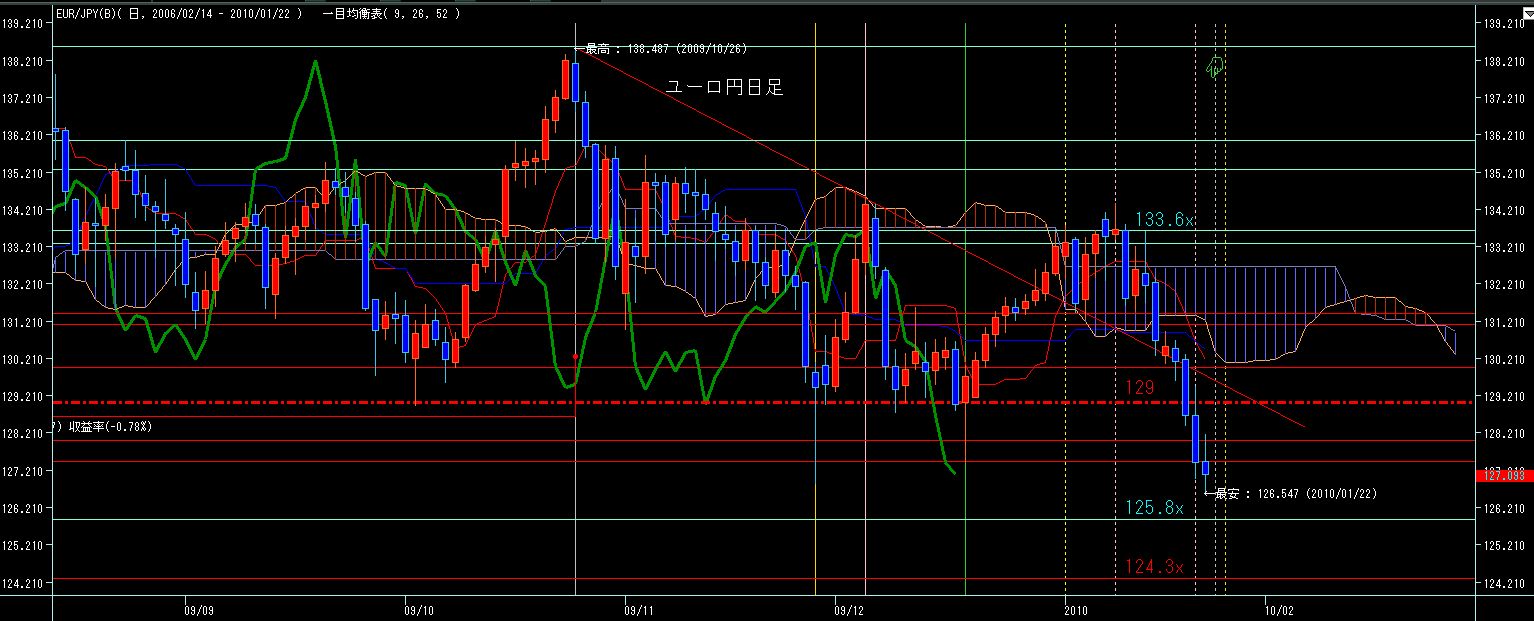 >また、下値切り下げ継続とした場合、次の節目としては、126割れにおいて陰連限定線が位置してます。その下は124円台ですね。