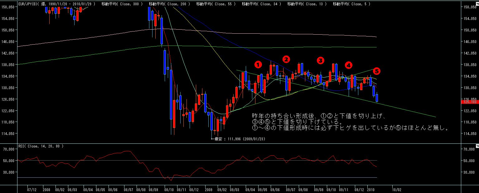 チャートで見ると、①~⑤まで、の下値はトレンドラインで結ぶ事が出来ます。