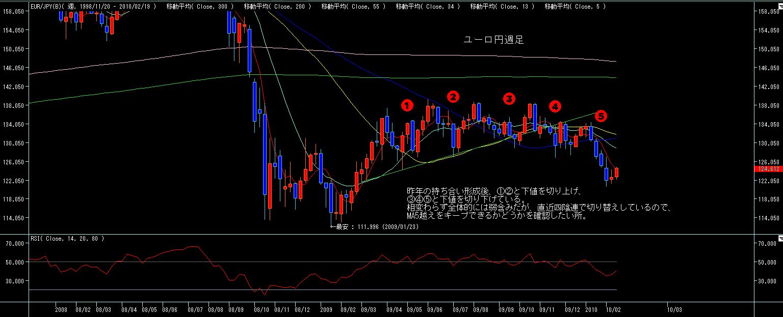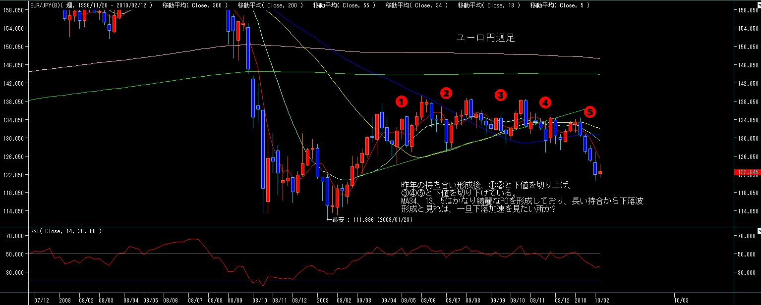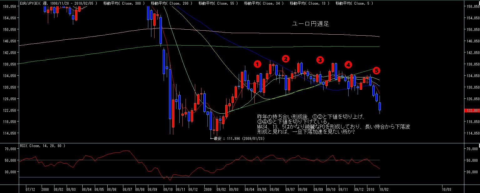 ユーロドルは六ヶ月、半年をかけて上げて来た値位置をここ二ヶ月で戻してしまっており、週足を見ると陰連限定線1.36台までは下落しそうな雰囲気です。