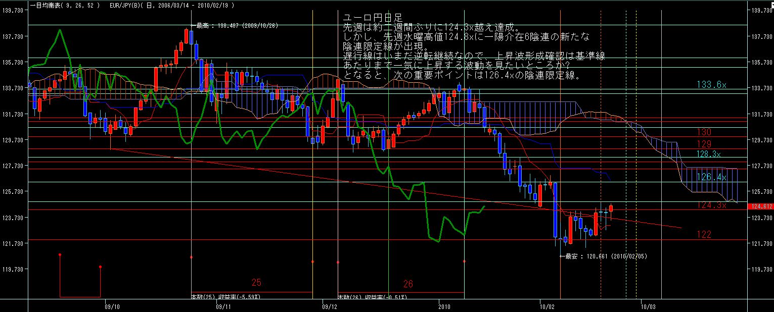 ドル円は何とか日足雲の上限割れを回避しましたが、ユーロドルは限定線割れで大きく下落。