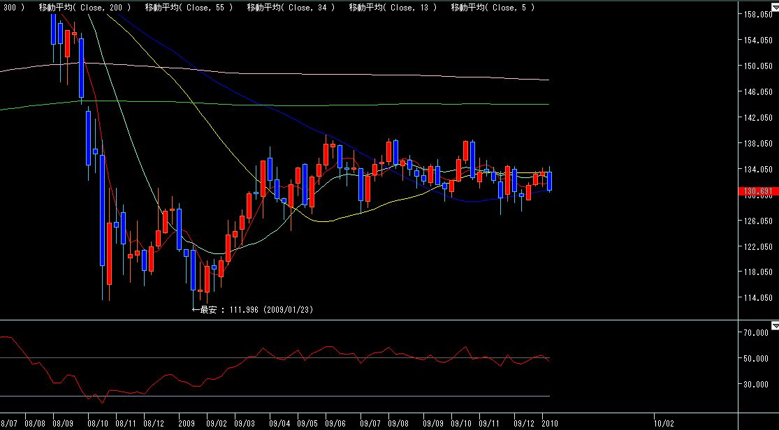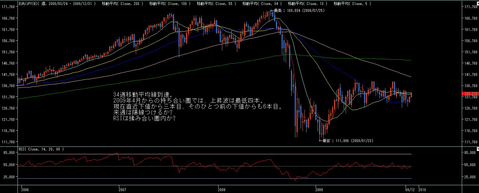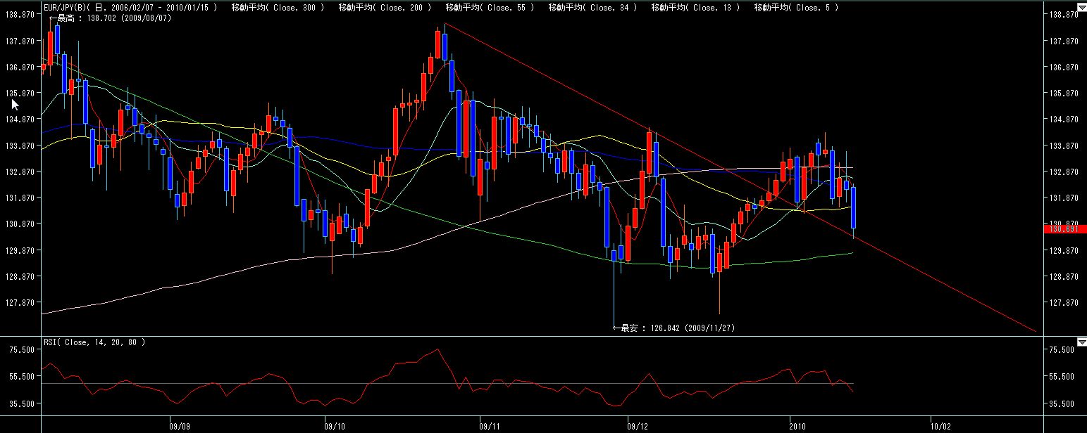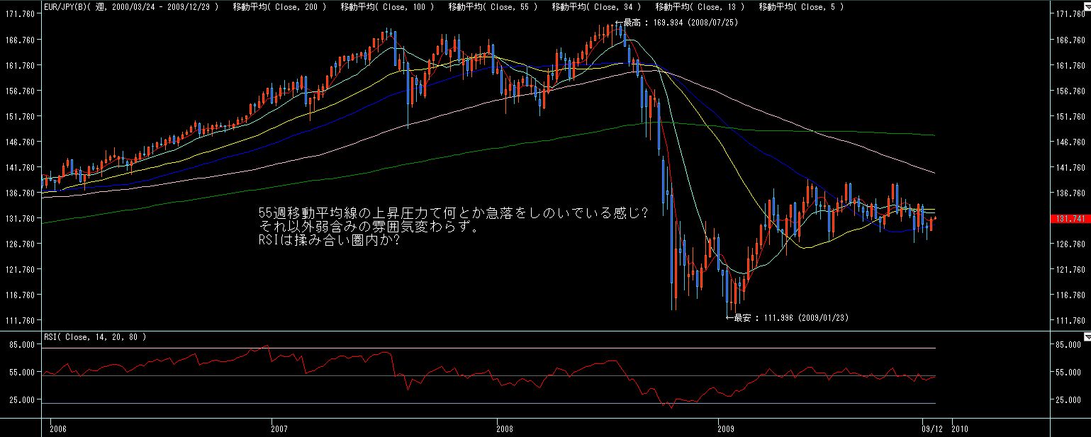ただ、ユーロ円、ドル円、共に、前日の陽線より上から陰線かぶせるという珍しいパターンな上に、ユーロ円は長い下ヒゲ終了というホントに珍しいローソク足パターンで、わかりづらいです。月曜の値動きで何とか来週の方向性を読みたい所ですね。
