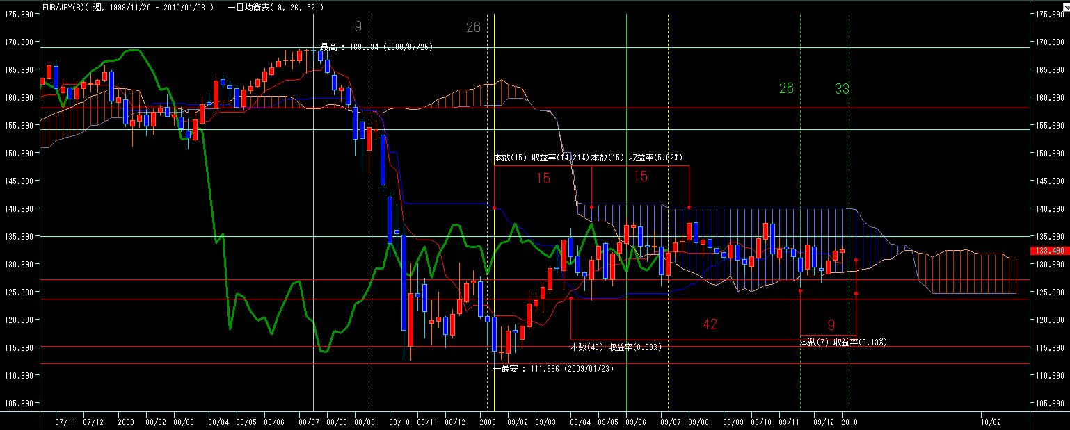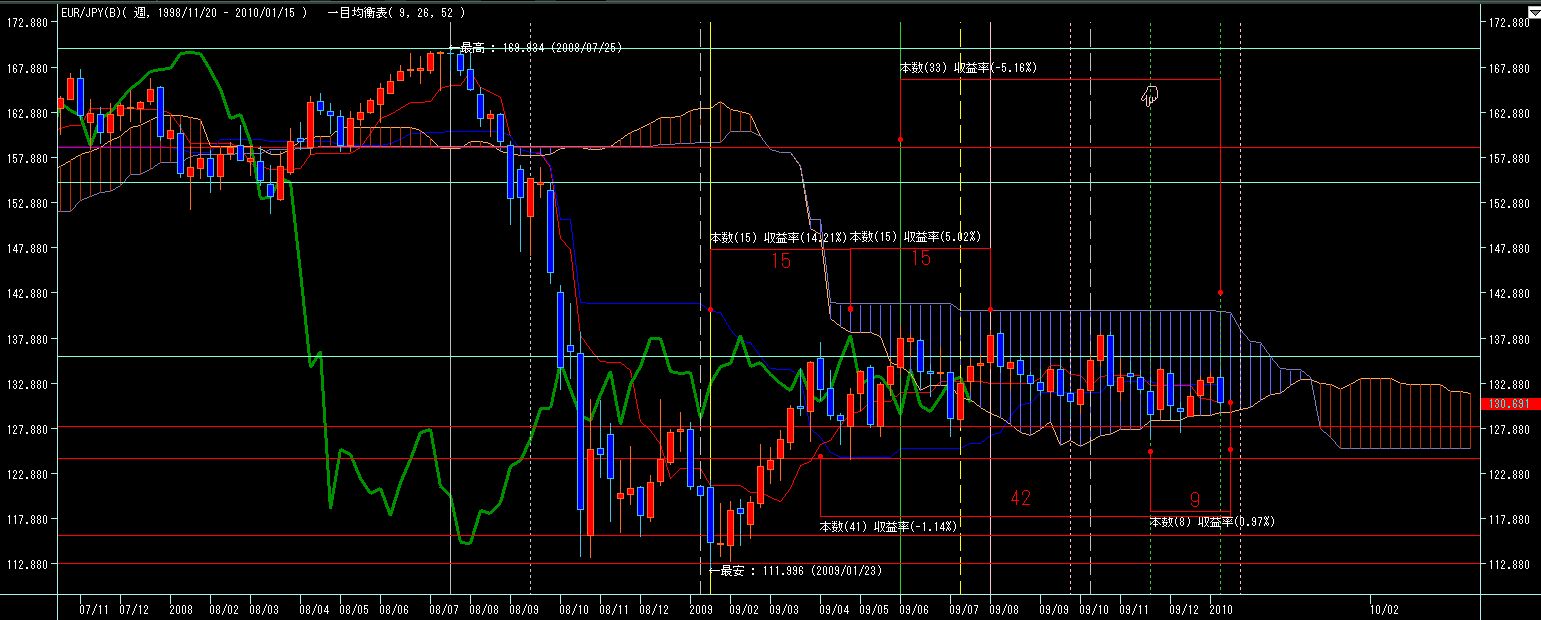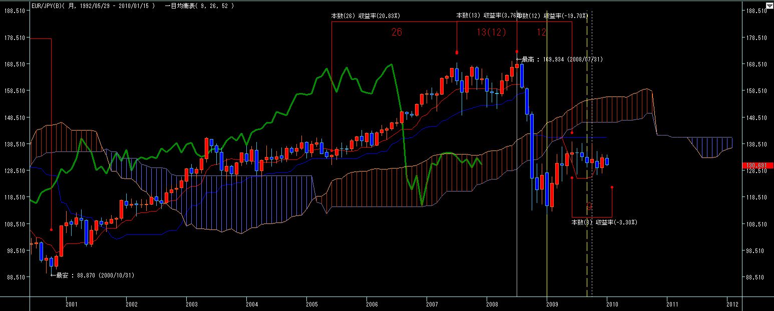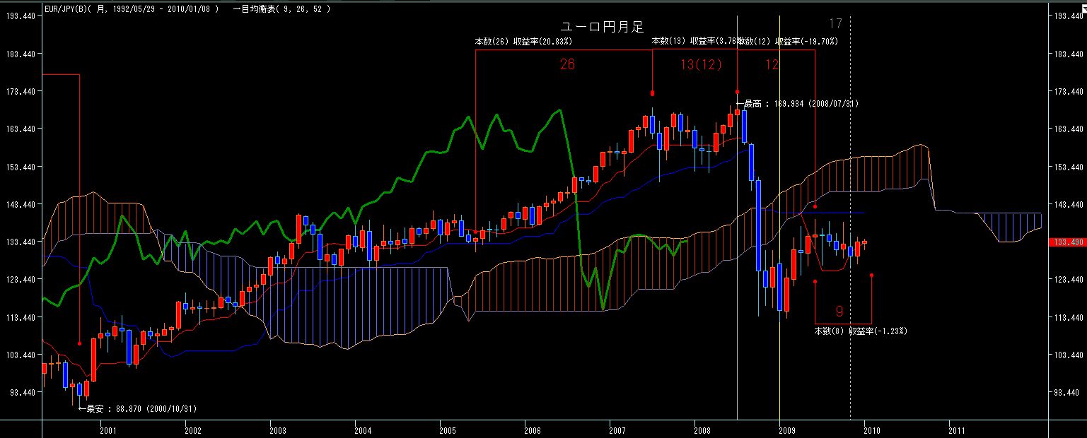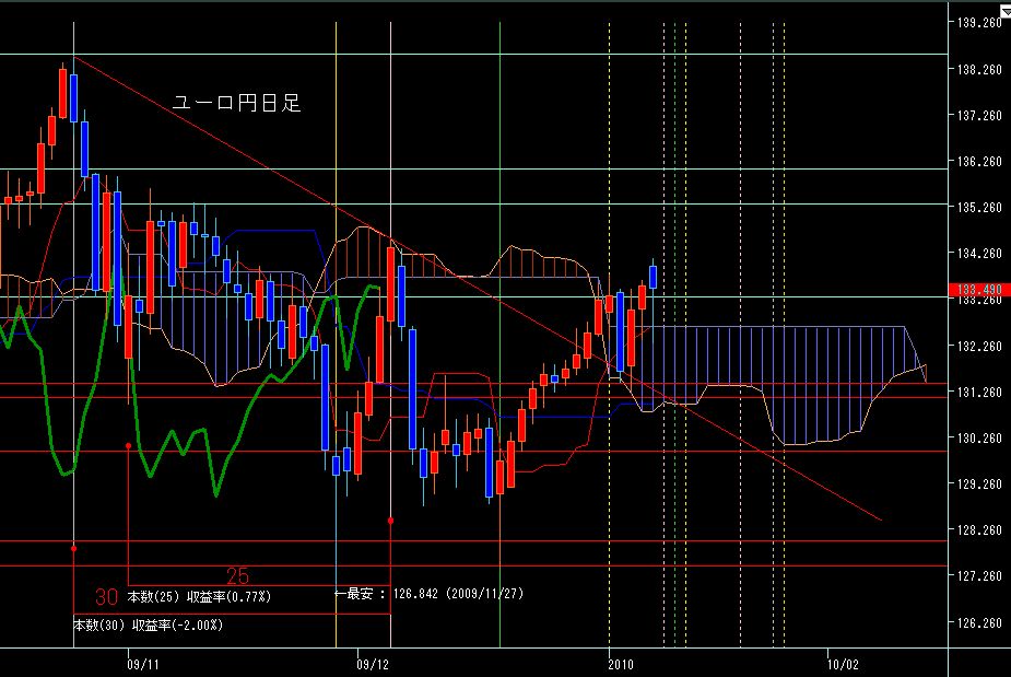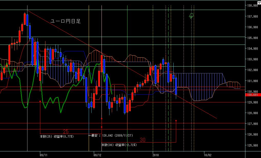 ドル円はいよいよ基準線割れ、ユーロドルは転換線逆転間際とあって、ここからさらに円高進行するかどうかの瀬戸際ですね。