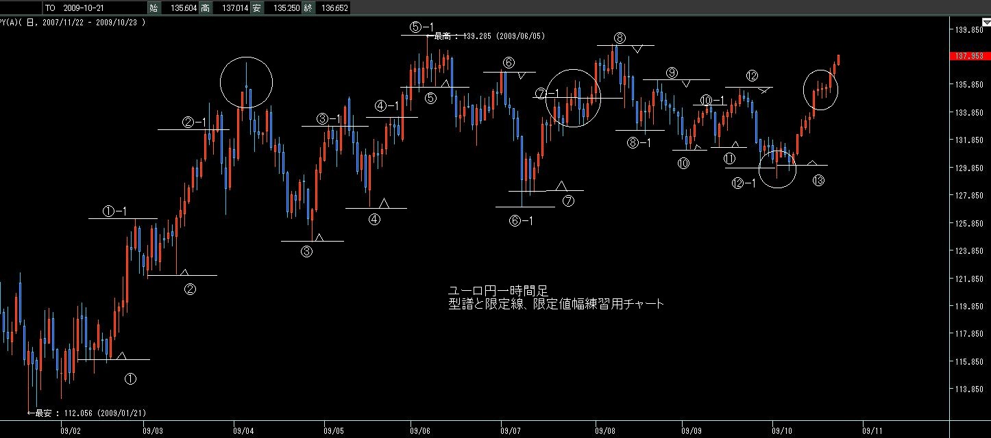 ローソク足五連以上が出現した場合、そこが基点(限定線)となって勢力が発生したと判断する訳ですが、その値幅帯がその後の相場の抵抗帯域となる....という事のようです(限定値幅)