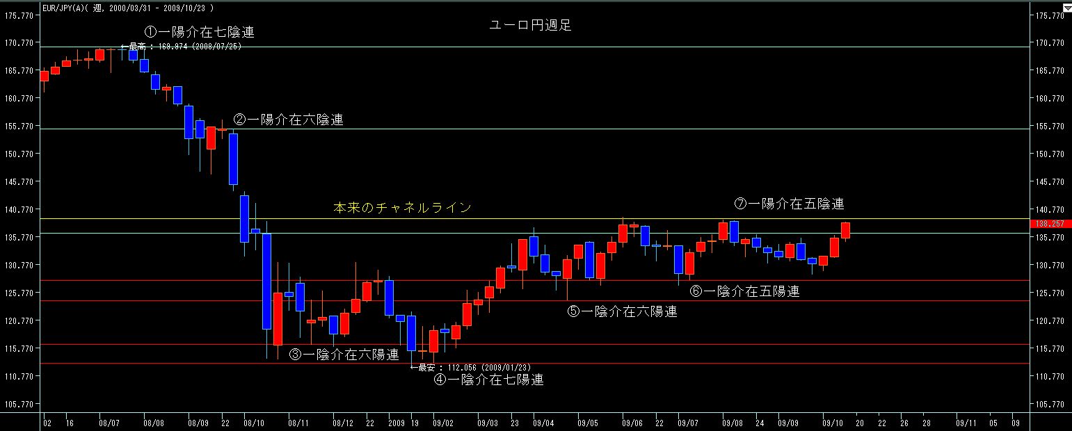 さて、ユーロ円週足で、この型譜、限定線を用いて相場の勢いと方向を判断してみたいと思います。