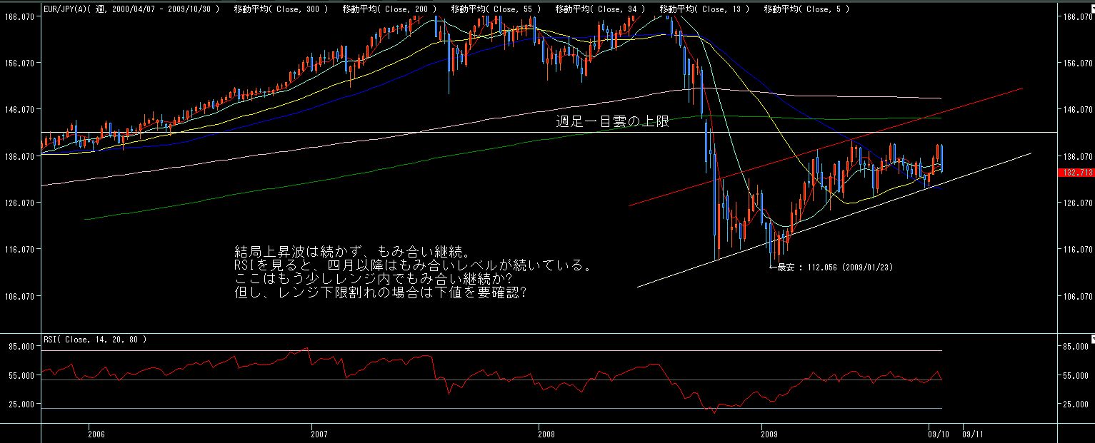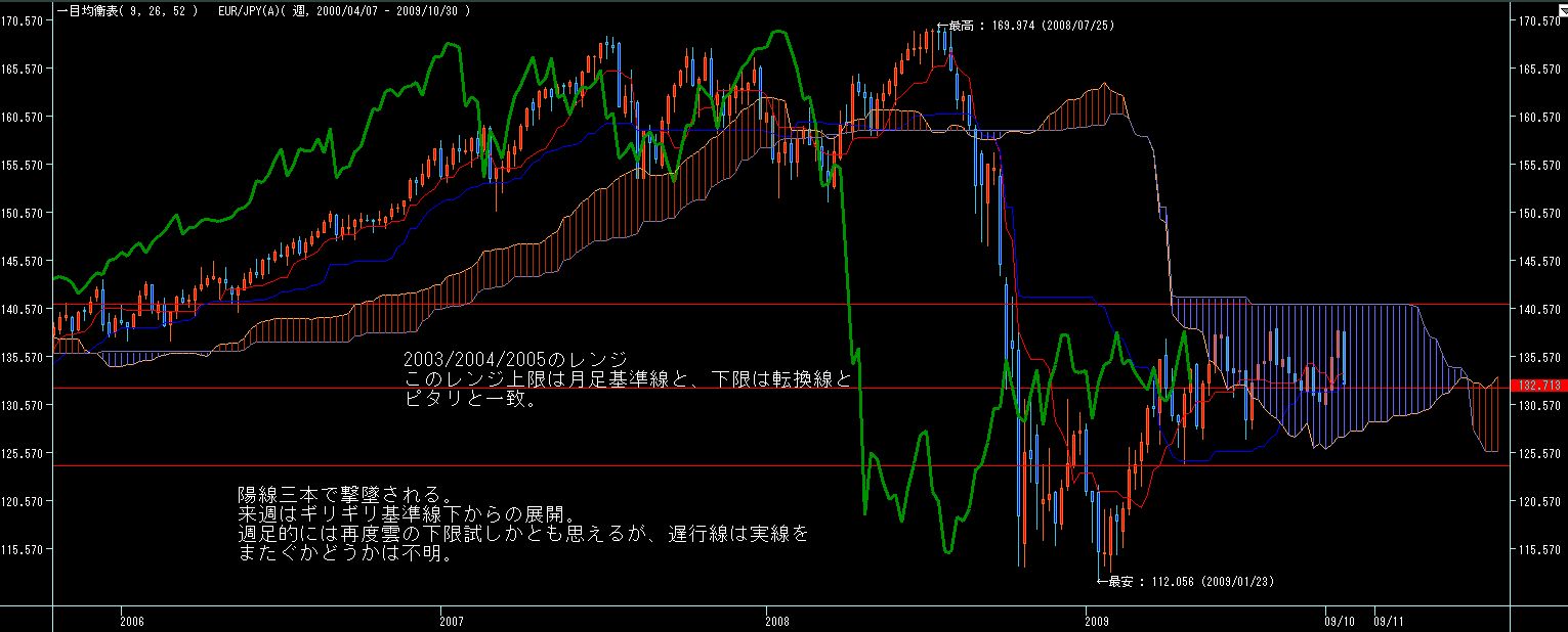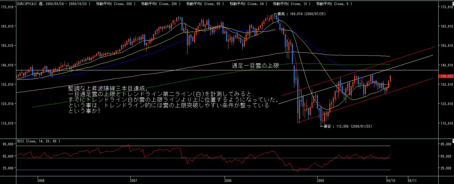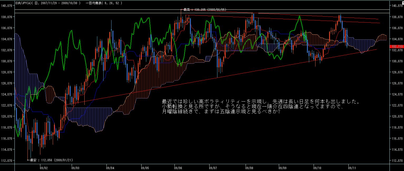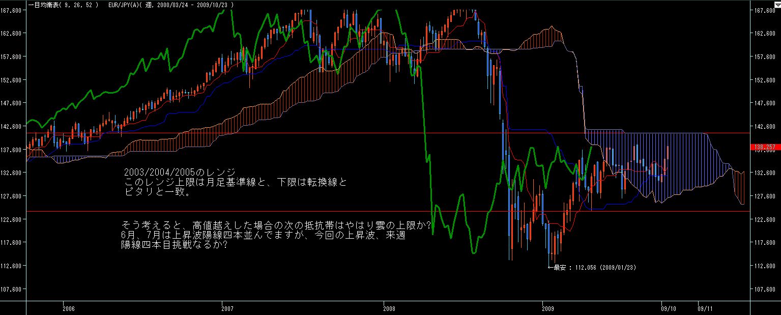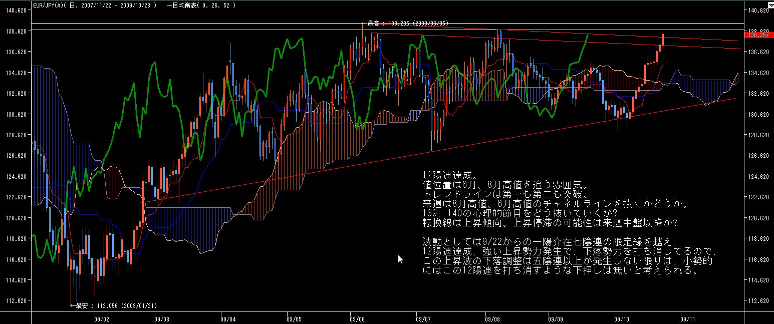 ところで、チャネルライン的には6月、8月高値がチャネル上限ですが、一目型譜で見ると、8/24からの一陽介在五陰連で下落勢力が発生するも、今週それを大きく上抜いてます(限定線突破)。